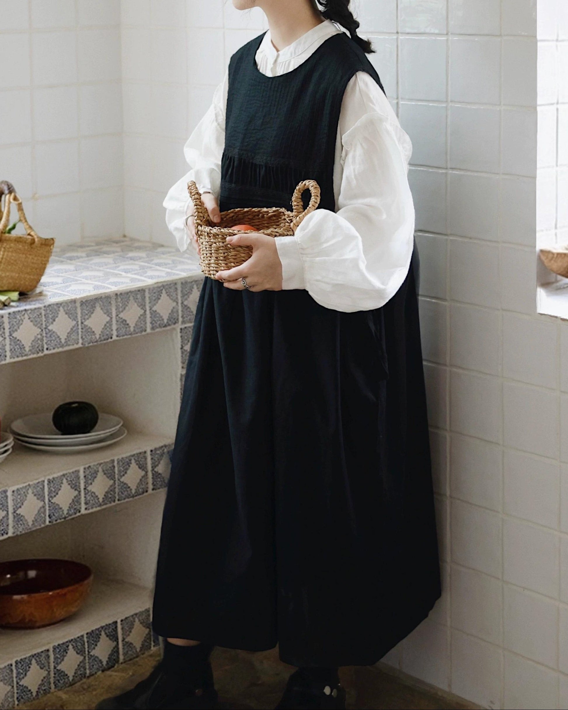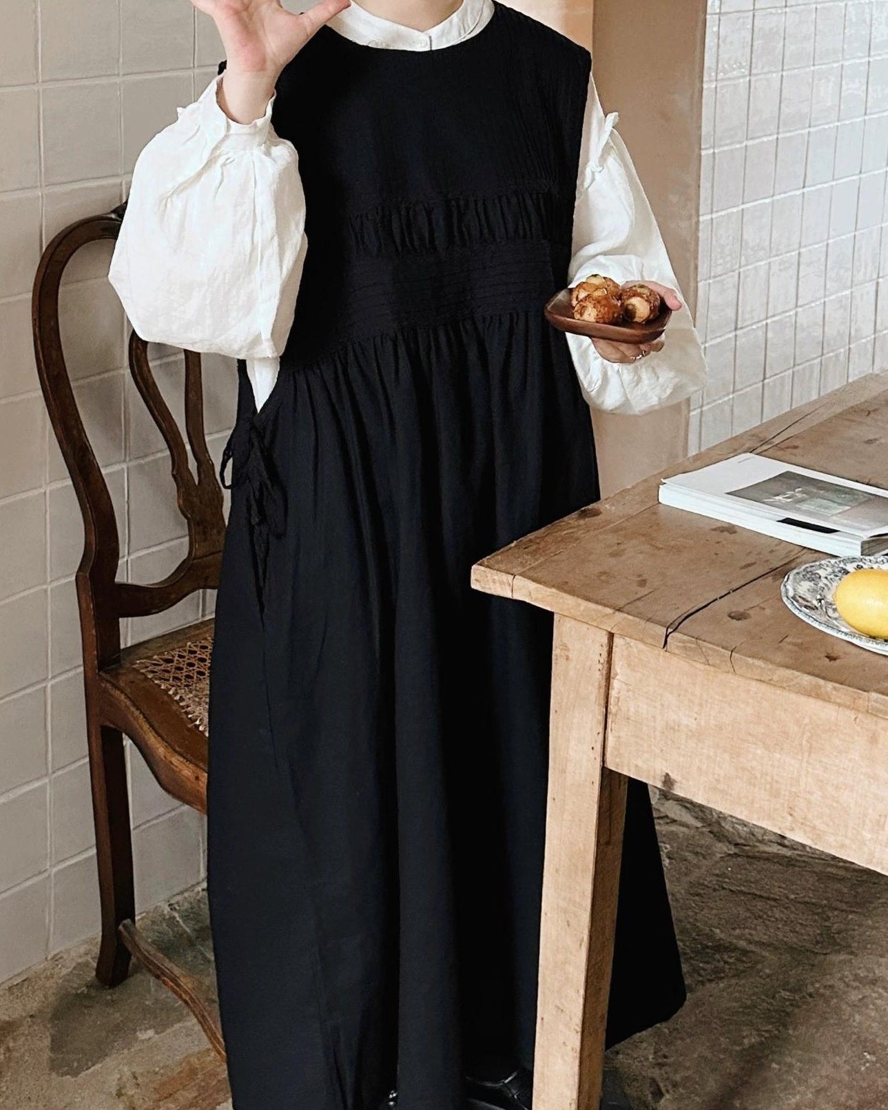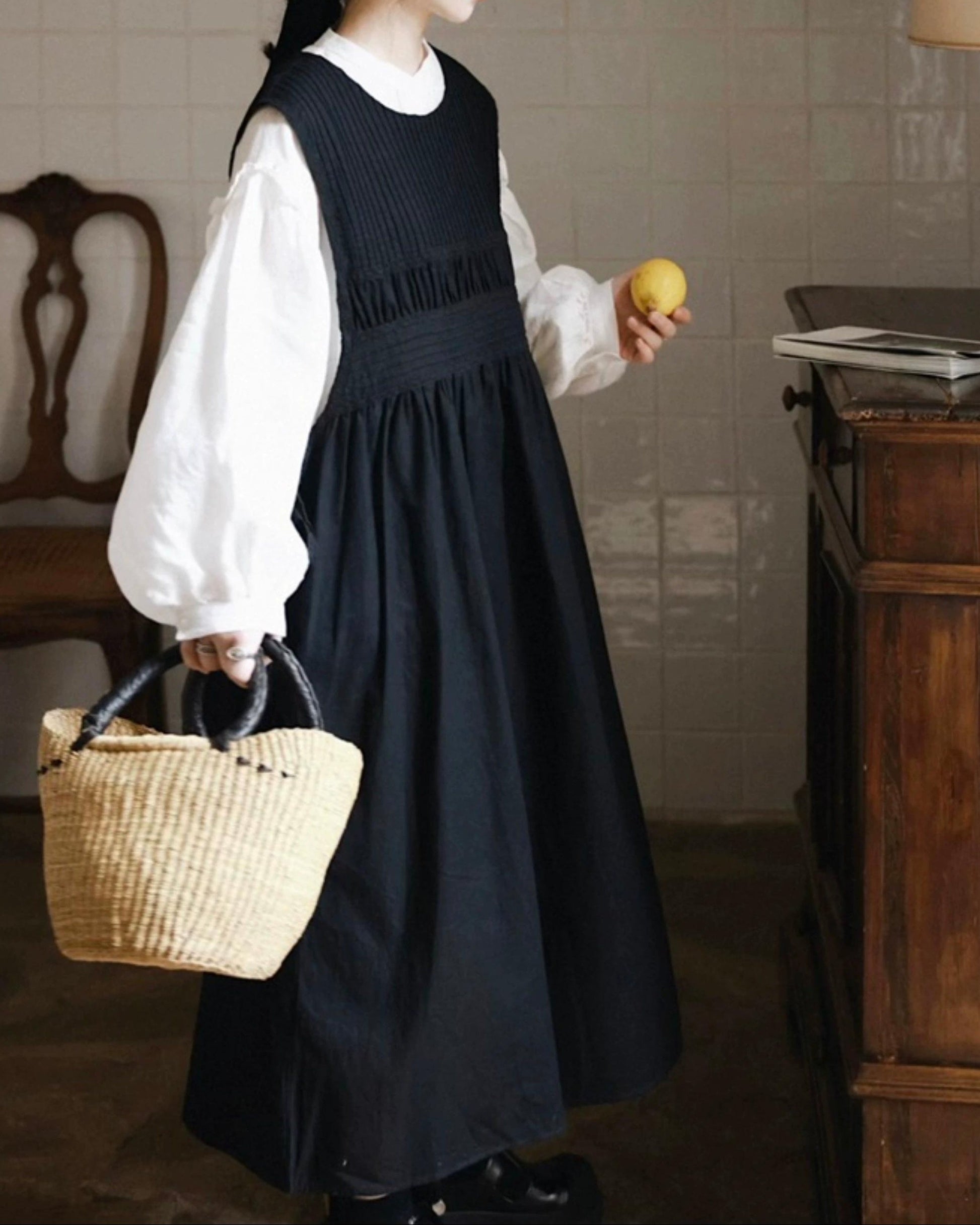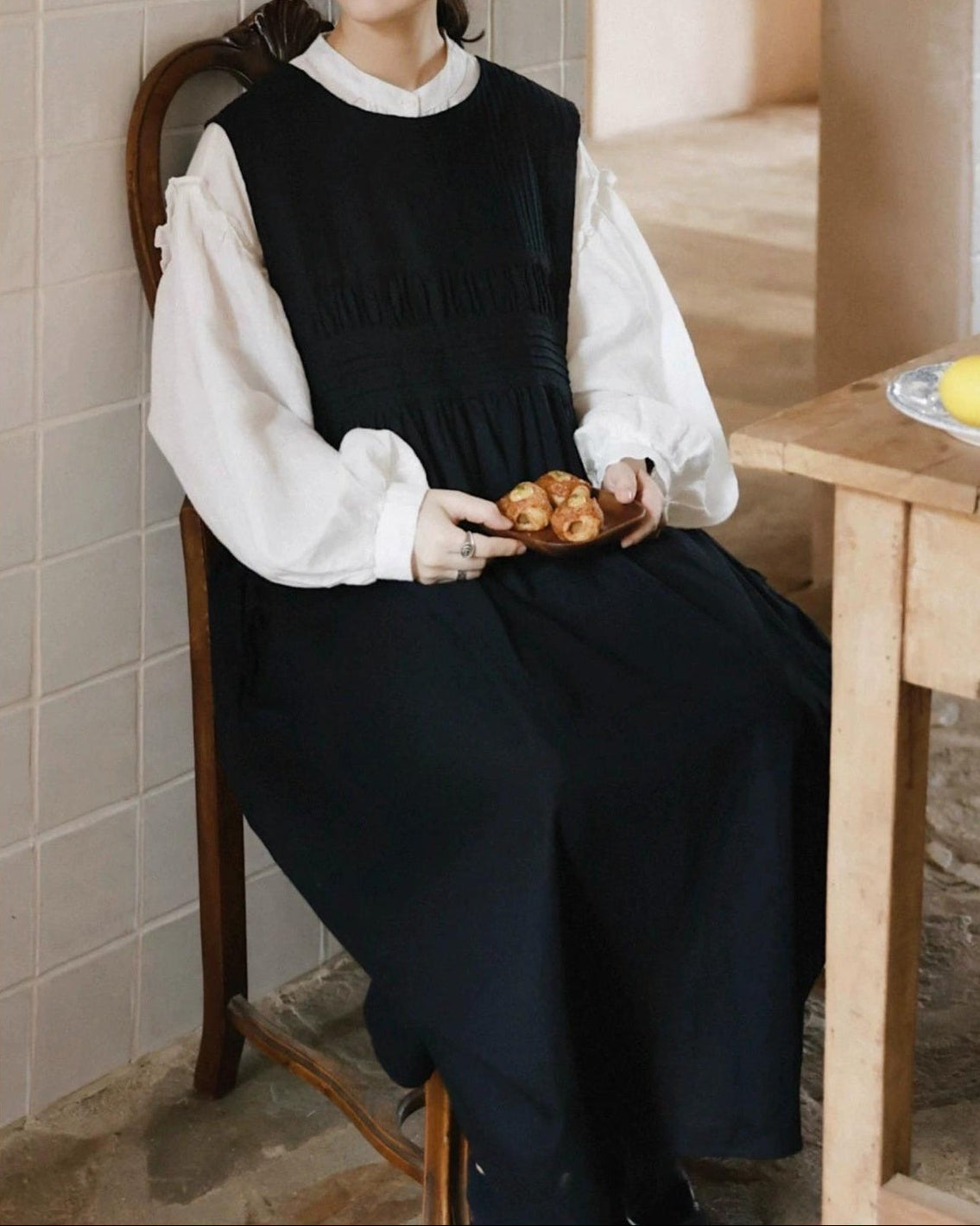 ラウンドネックレトロベストワンピースは、柔らかな質感が魅力のコットン素材を使用しています。黒のシンプルなデザインは、フレアシルエットが女性らしさを引き立て、カジュアルな場面や休日のお出かけにぴったり。胸元に施された繊細なプリーツがアクセントになり、スタイリング次第でさまざまなシーンにマッチします。日常使いにも特別な日にでも活躍するアイテムです。