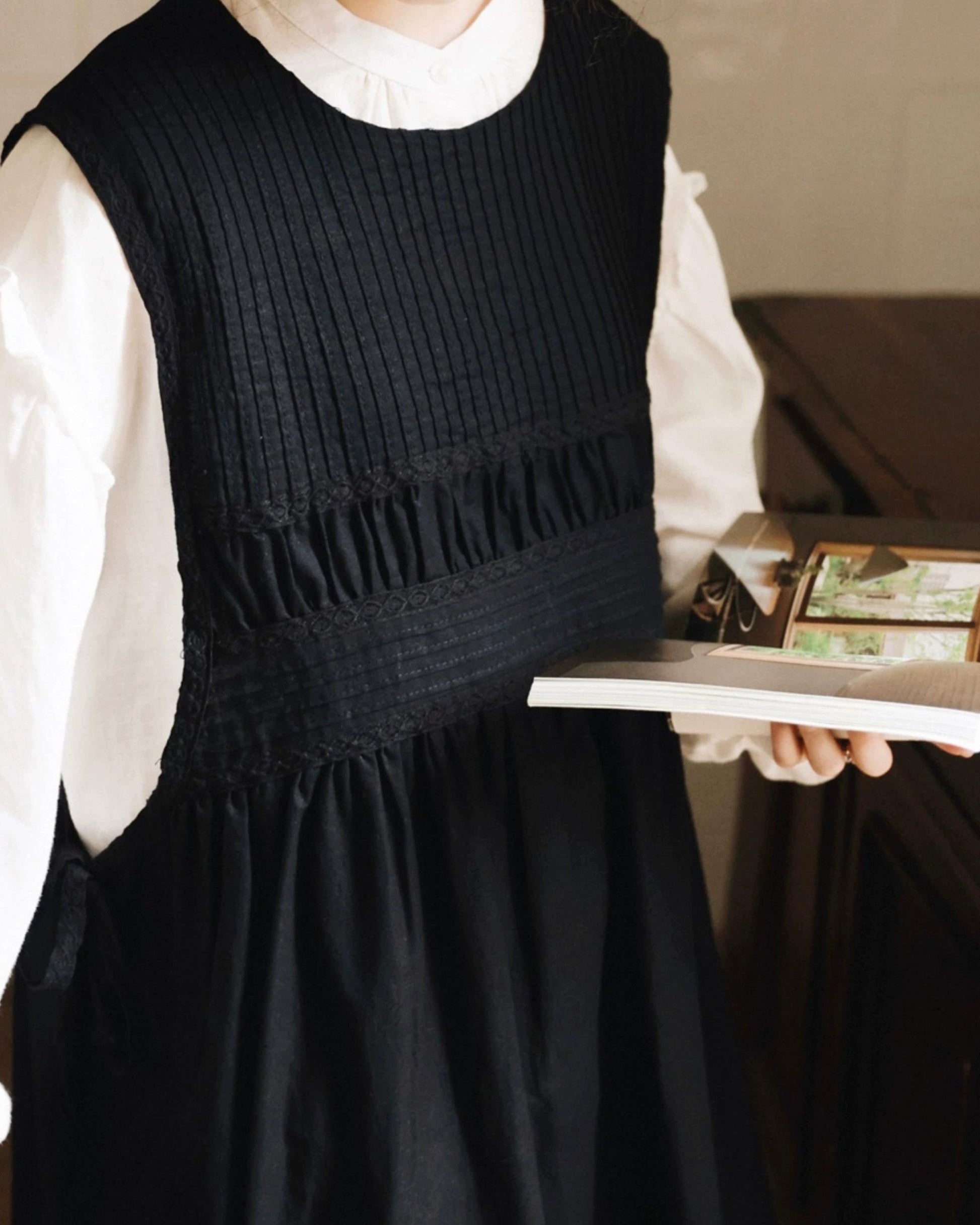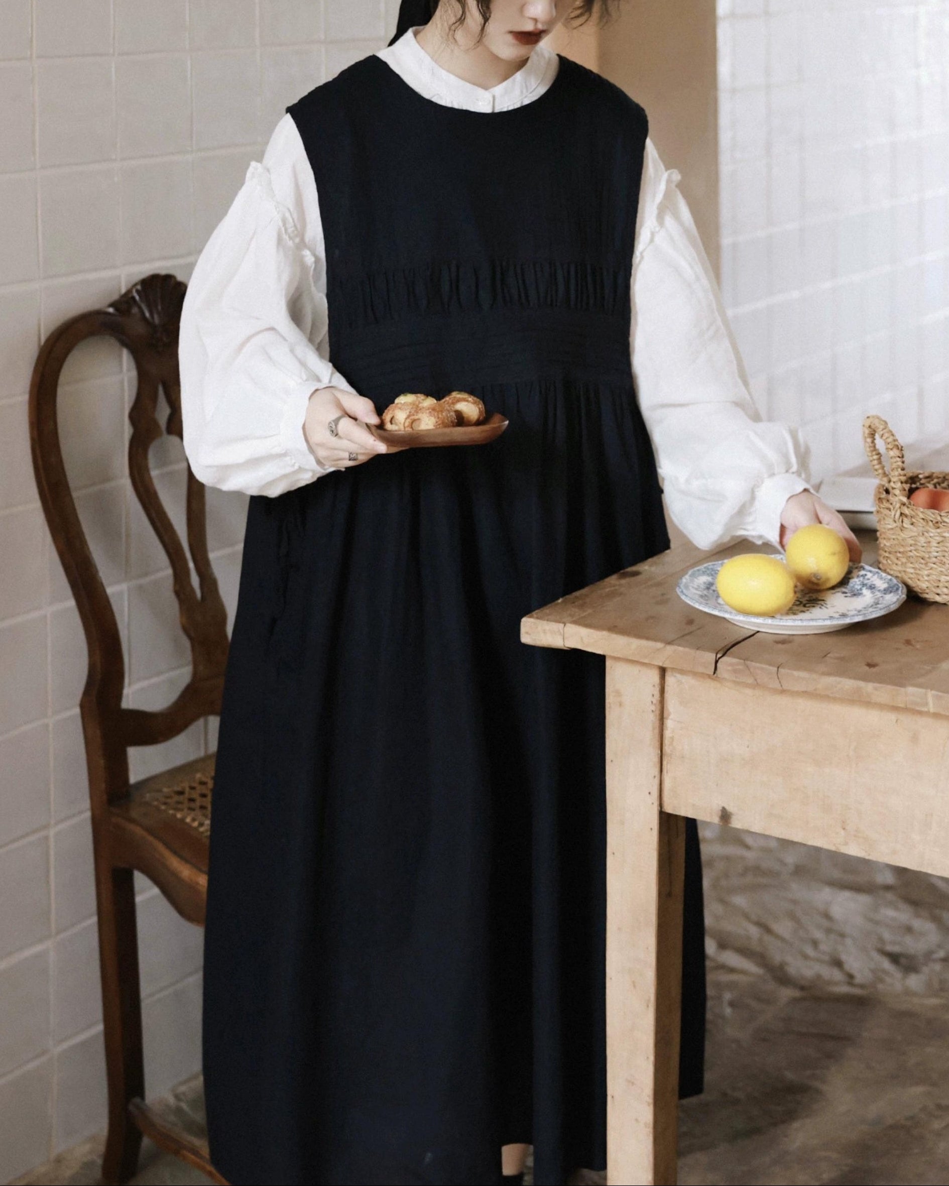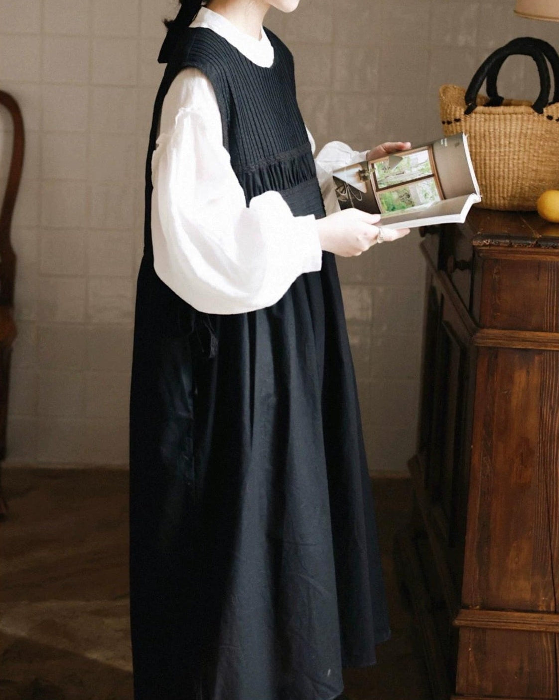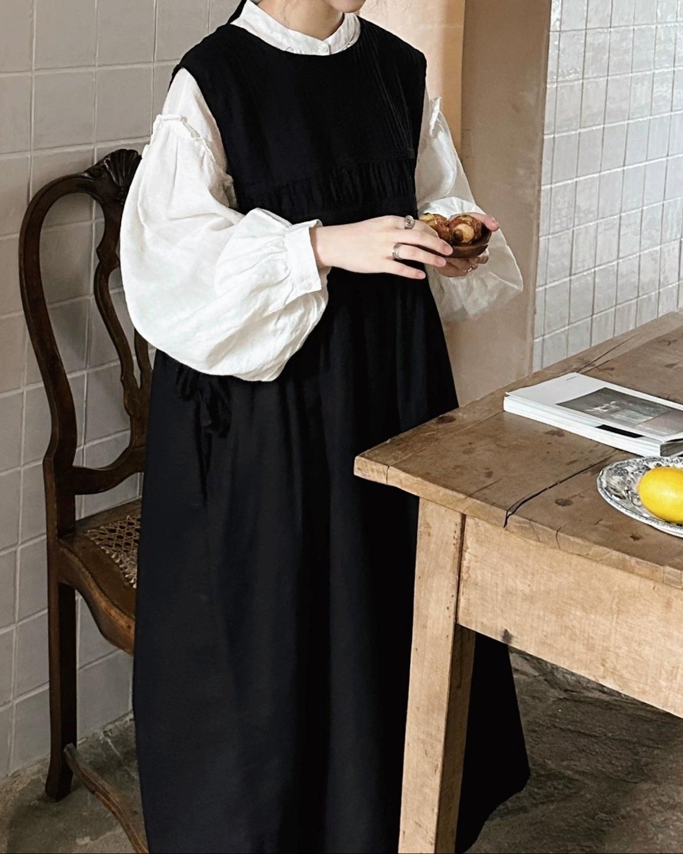 ラウンドネックレトロベストワンピースは、柔らかな質感が魅力のコットン素材を使用しています。黒のシンプルなデザインは、フレアシルエットが女性らしさを引き立て、カジュアルな場面や休日のお出かけにぴったり。胸元に施された繊細なプリーツがアクセントになり、スタイリング次第でさまざまなシーンにマッチします。日常使いにも特別な日にでも活躍するアイテムです。