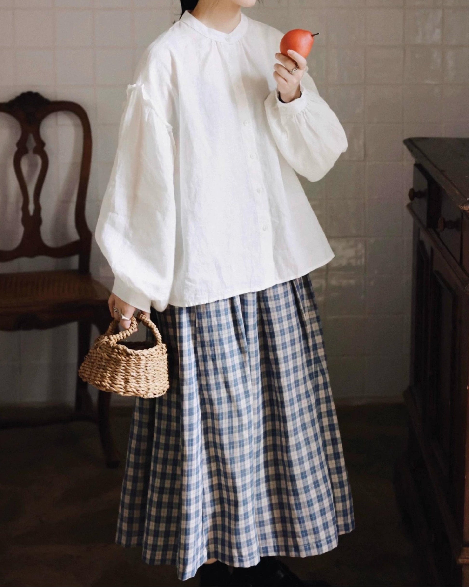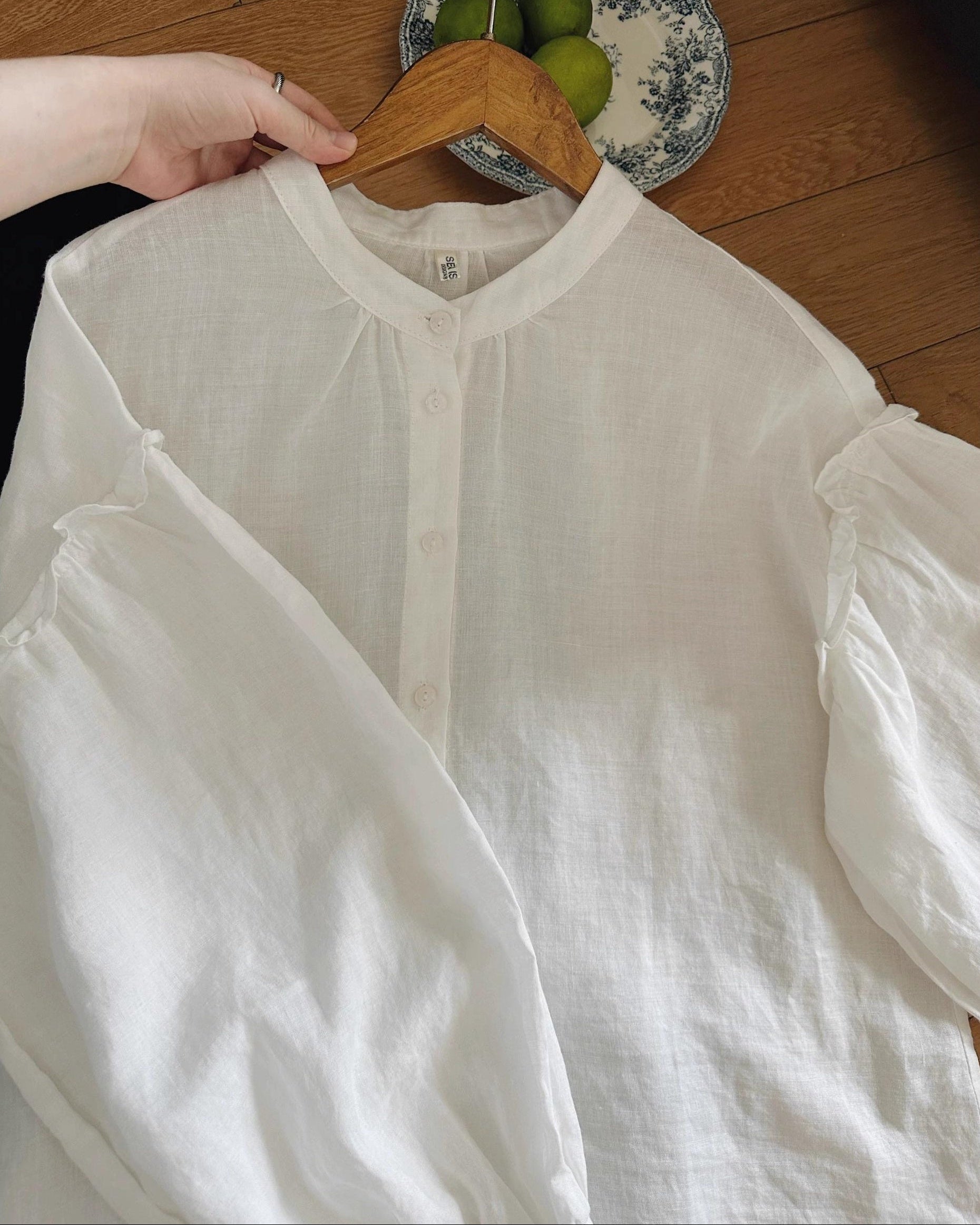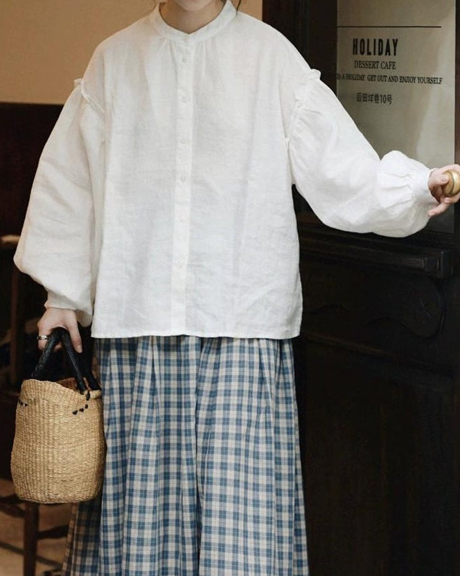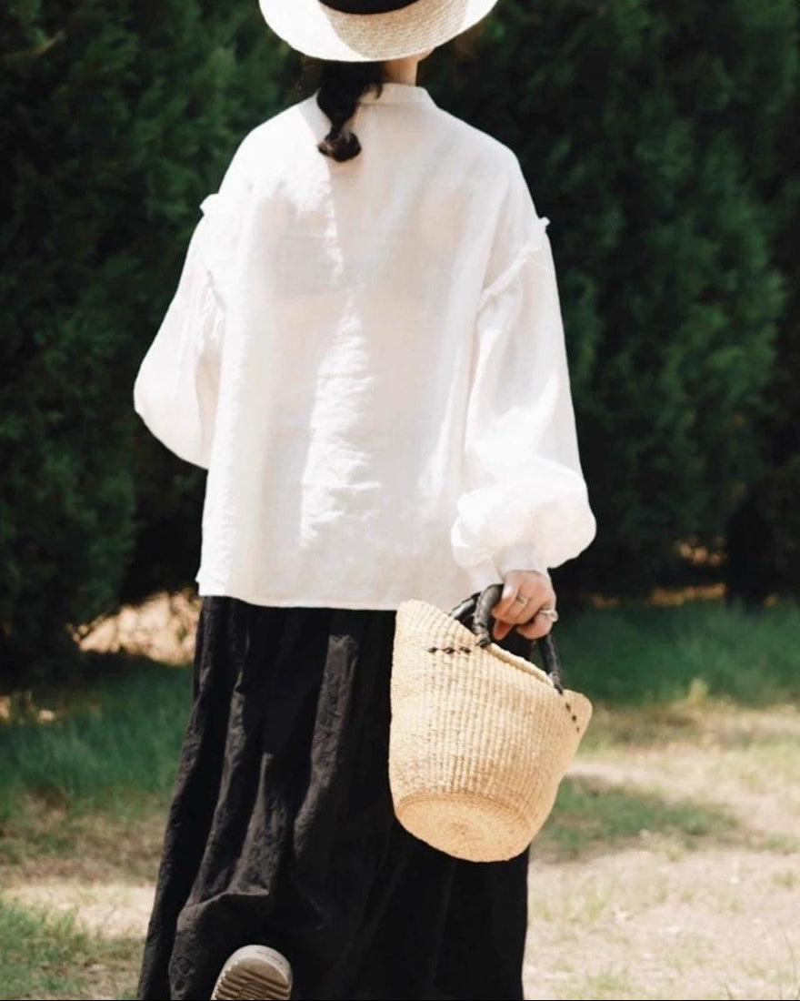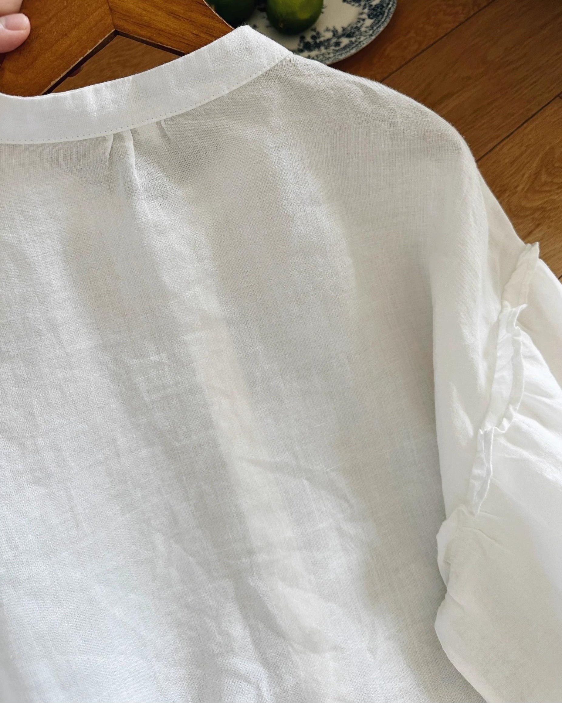 軽やかな白色の麻素材とボリュームのある袖が特徴で、シンプルながらもエレガントな印象を与えます。手元のボタンや袖口のデザインが、全体のスタイルに豊かなアクセントを加えています。