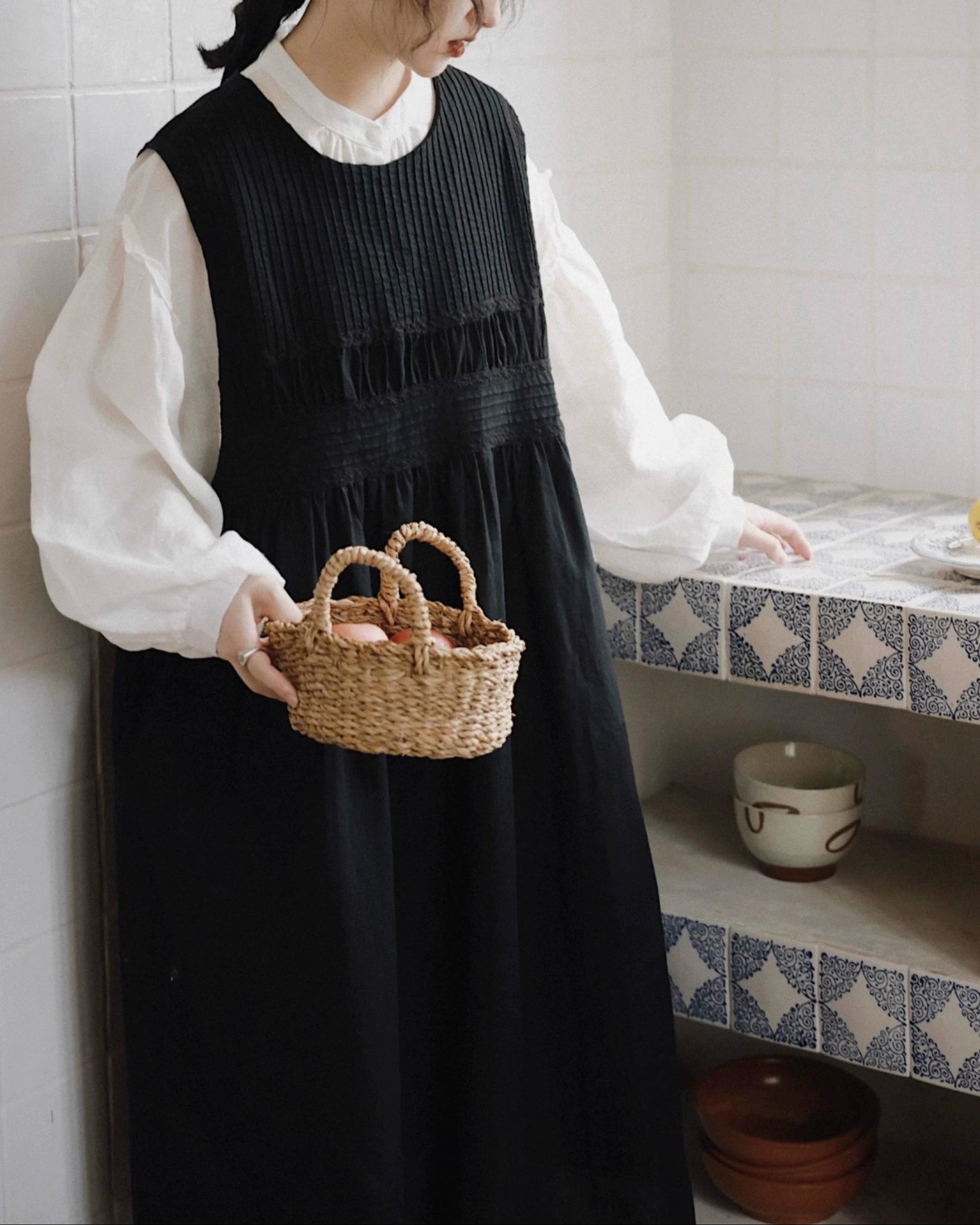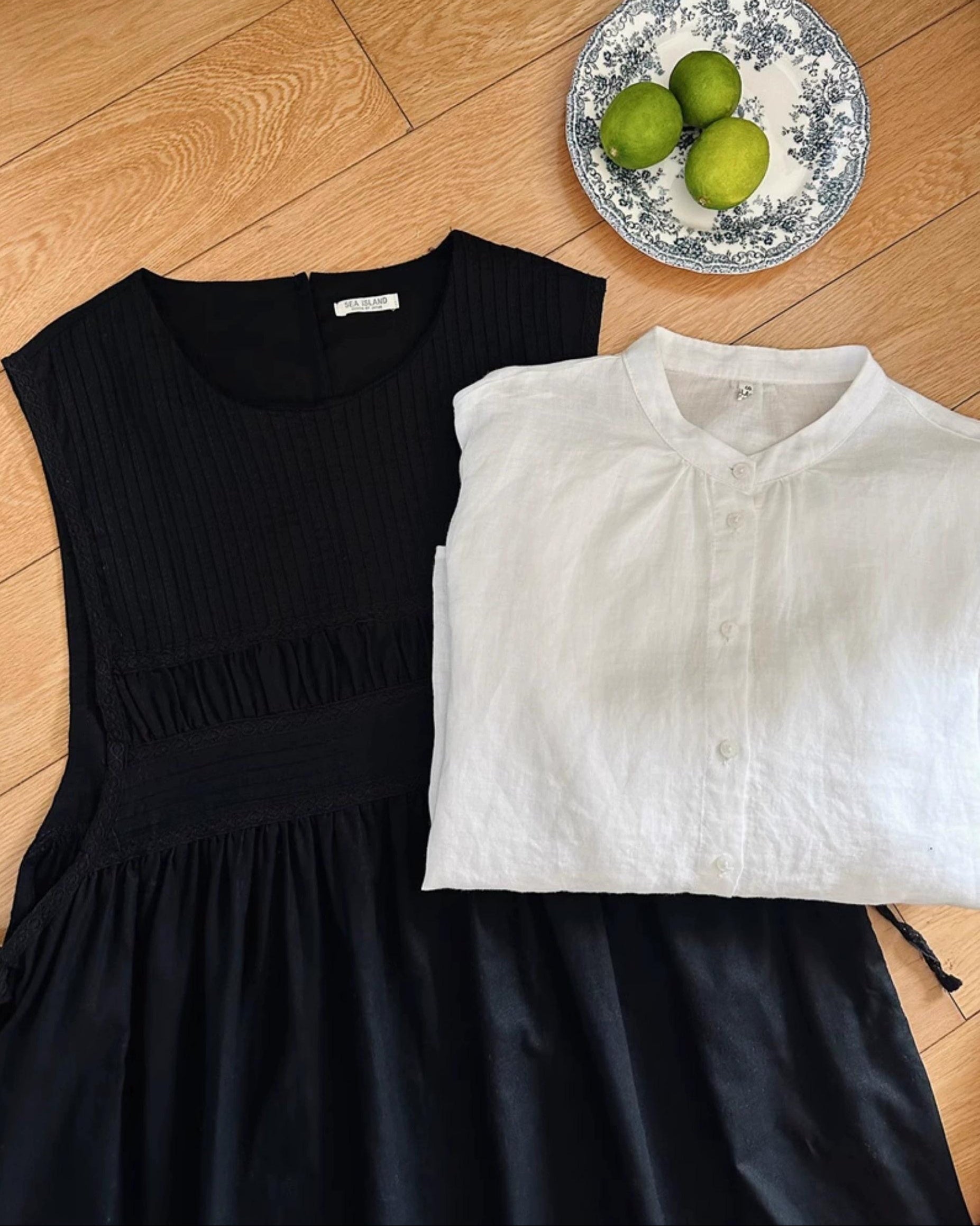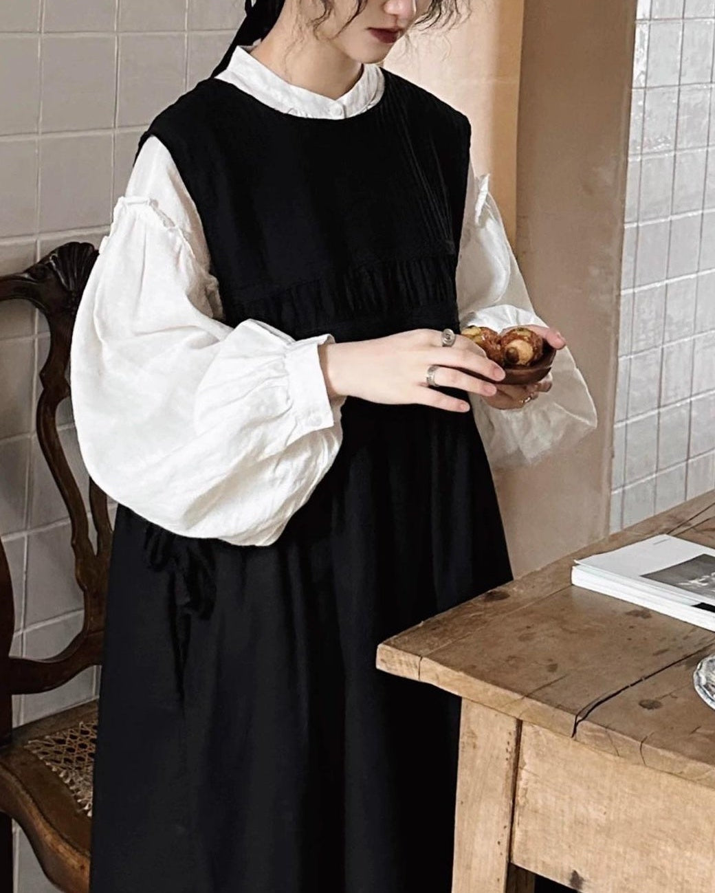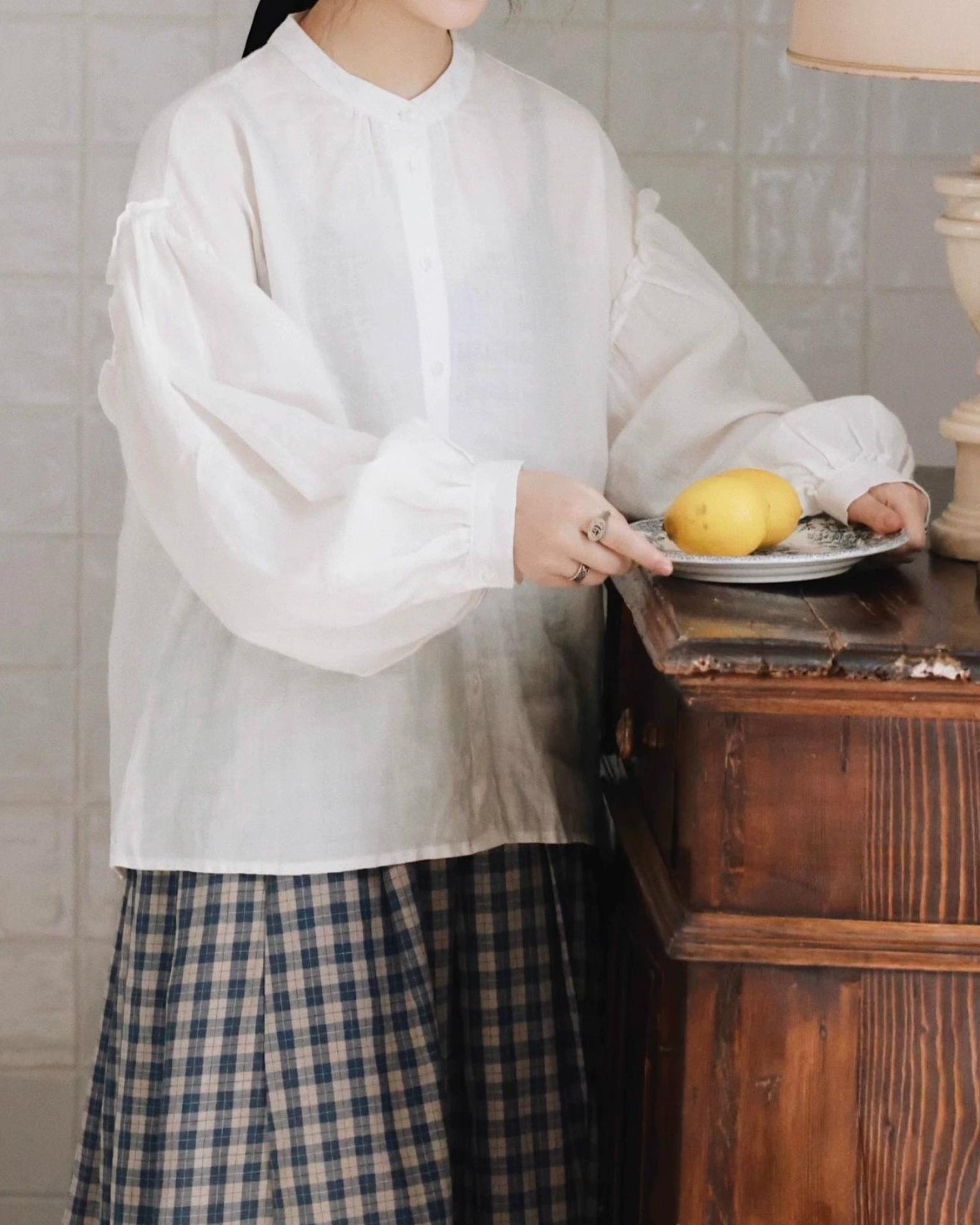 軽やかな白色の麻素材とボリュームのある袖が特徴で、シンプルながらもエレガントな印象を与えます。手元のボタンや袖口のデザインが、全体のスタイルに豊かなアクセントを加えています。