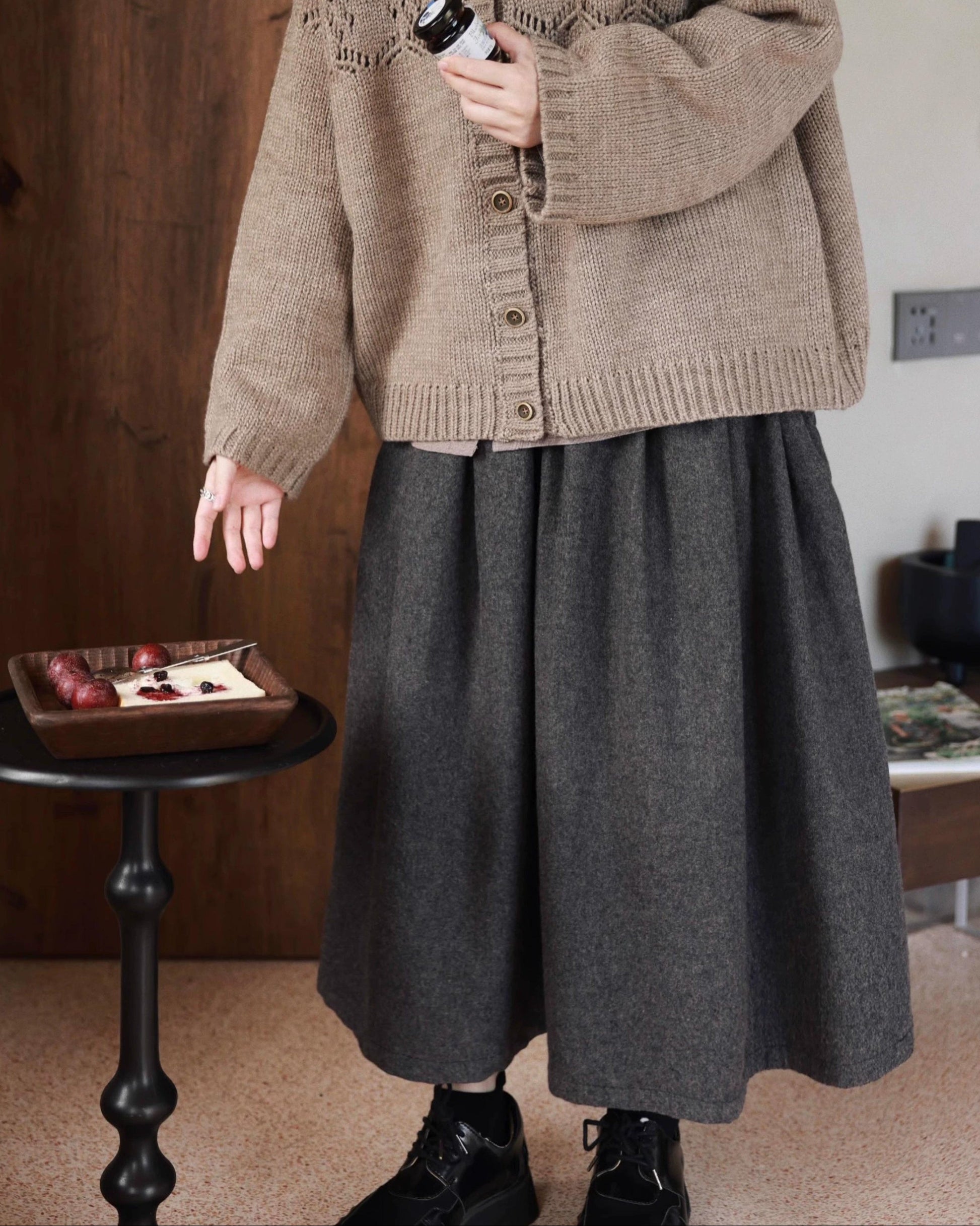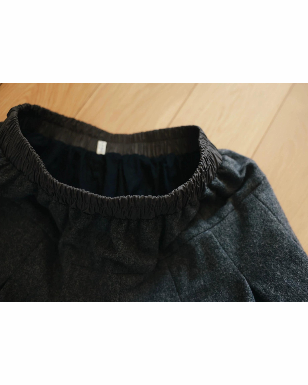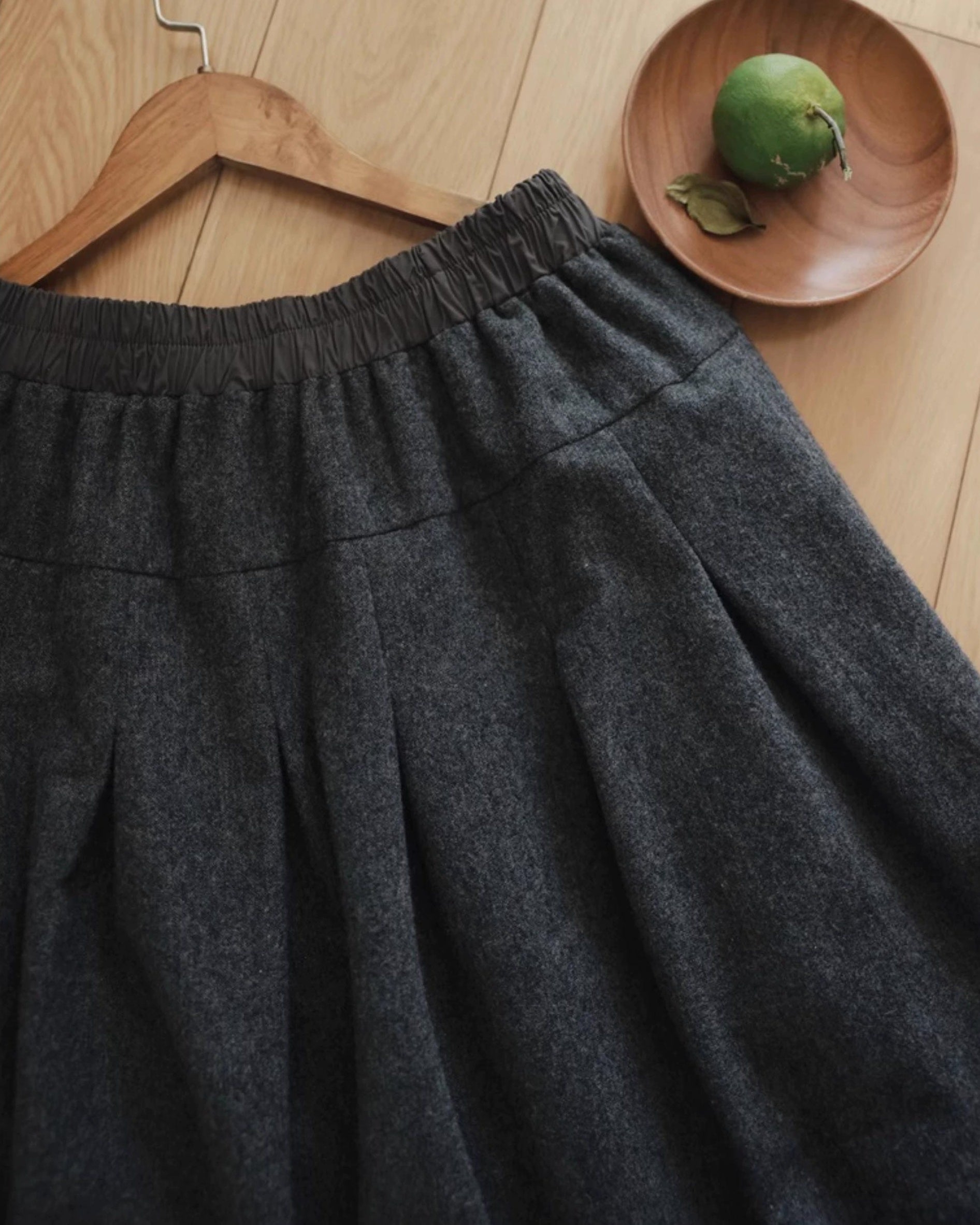くるぶしにかかるフレアシルエットが特徴で、シンプルなデザインがさまざまなスタイルにマッチします。上品なダークグレーの色合いは、カジュアルからフォーマルまで幅広いシーンで活躍。ウエストはゴム仕様で、快適な着心地を提供します。