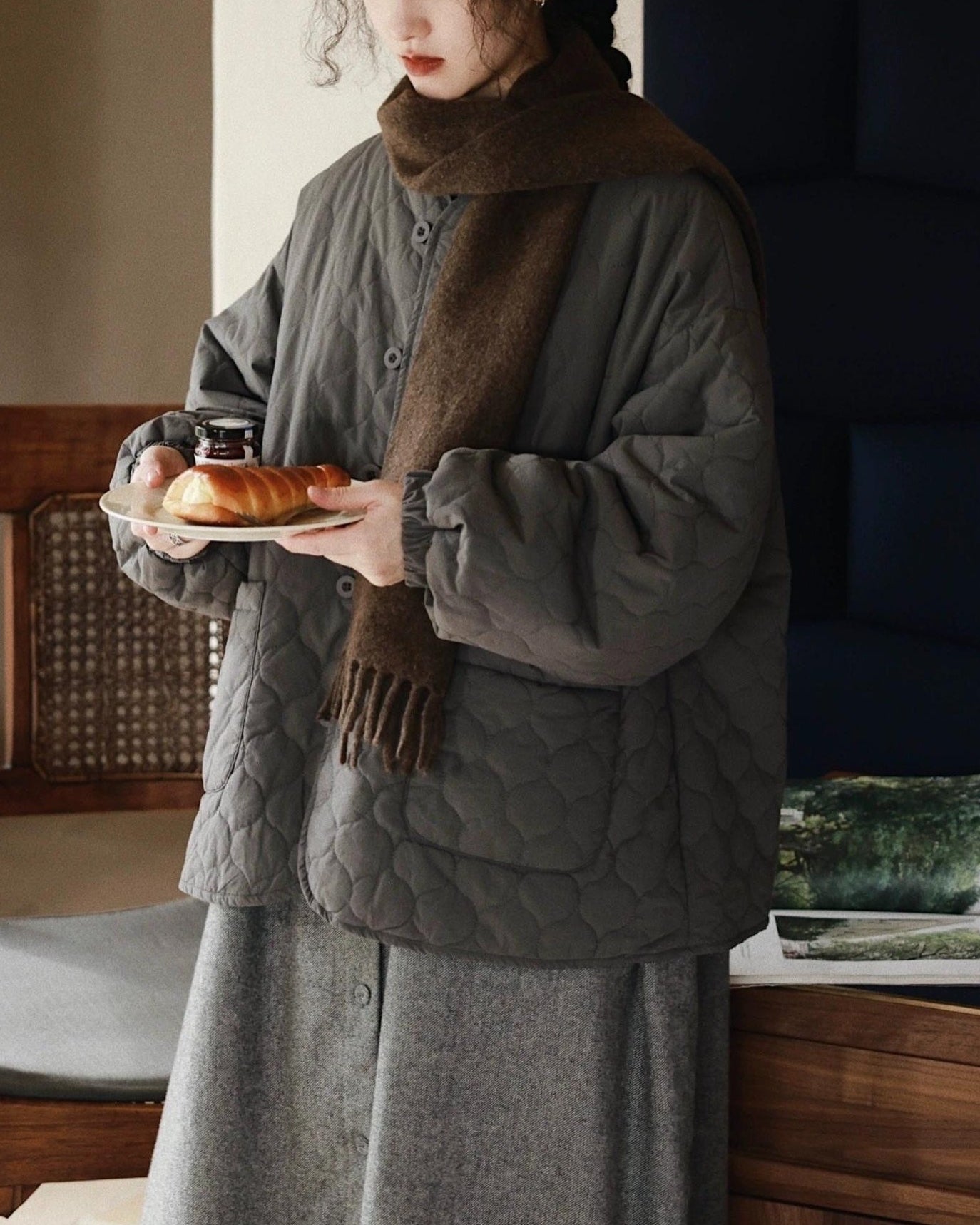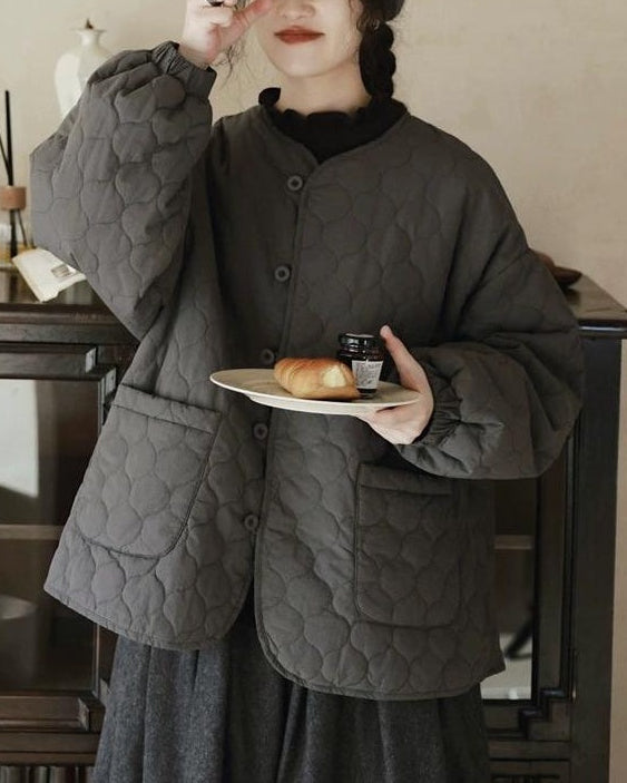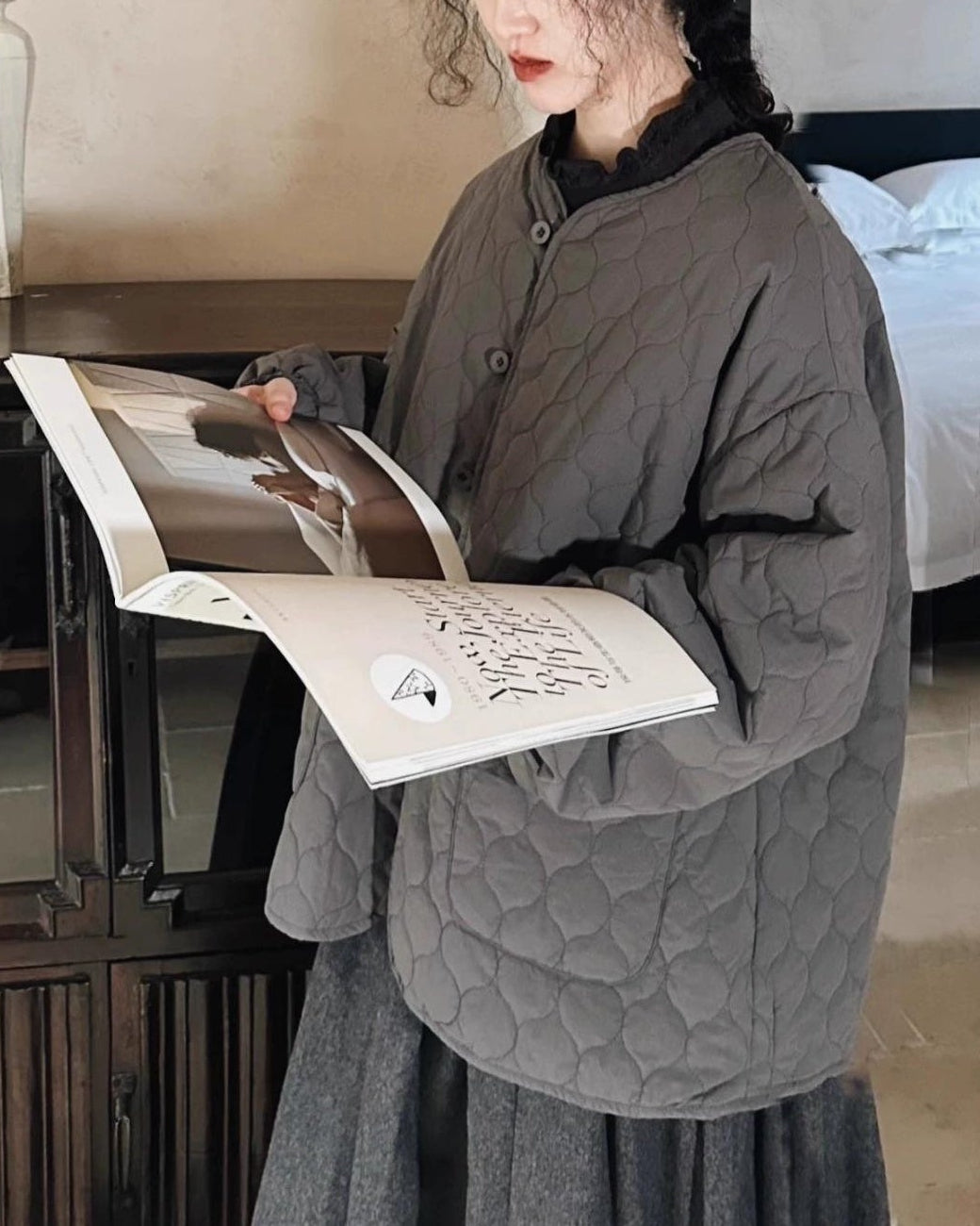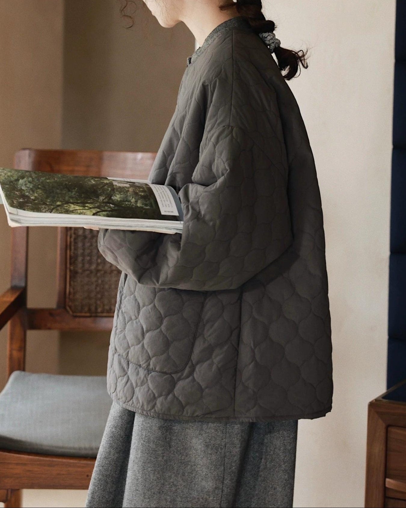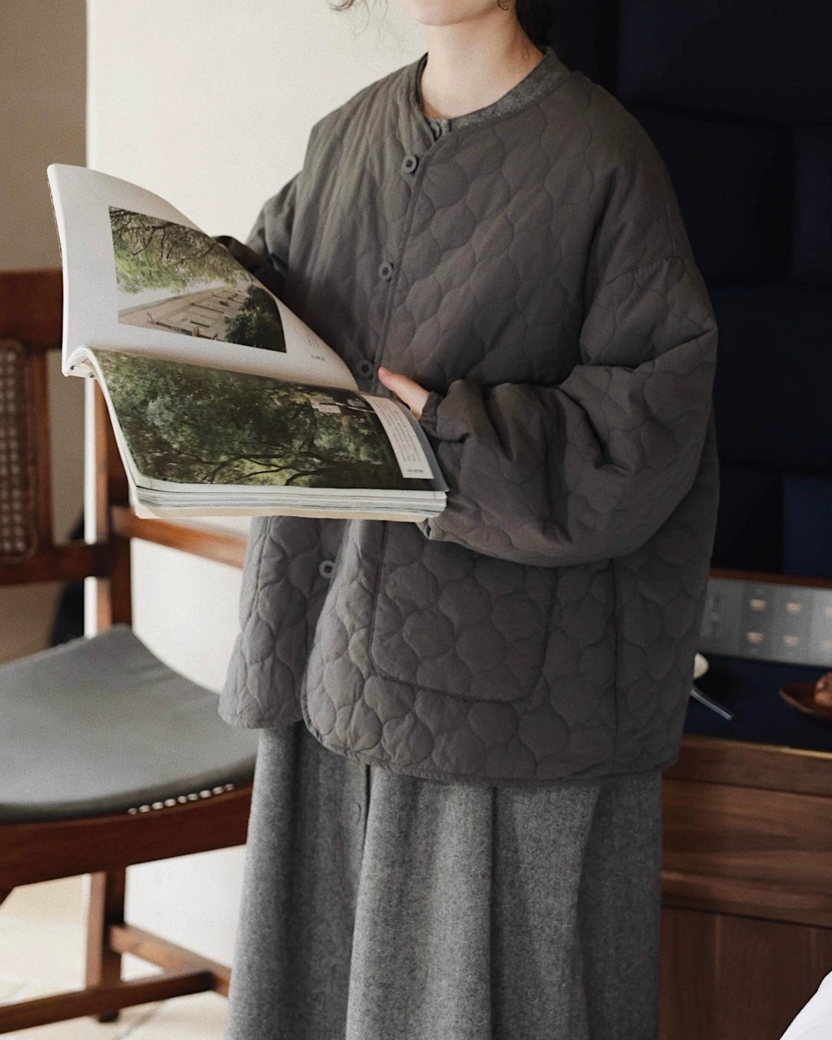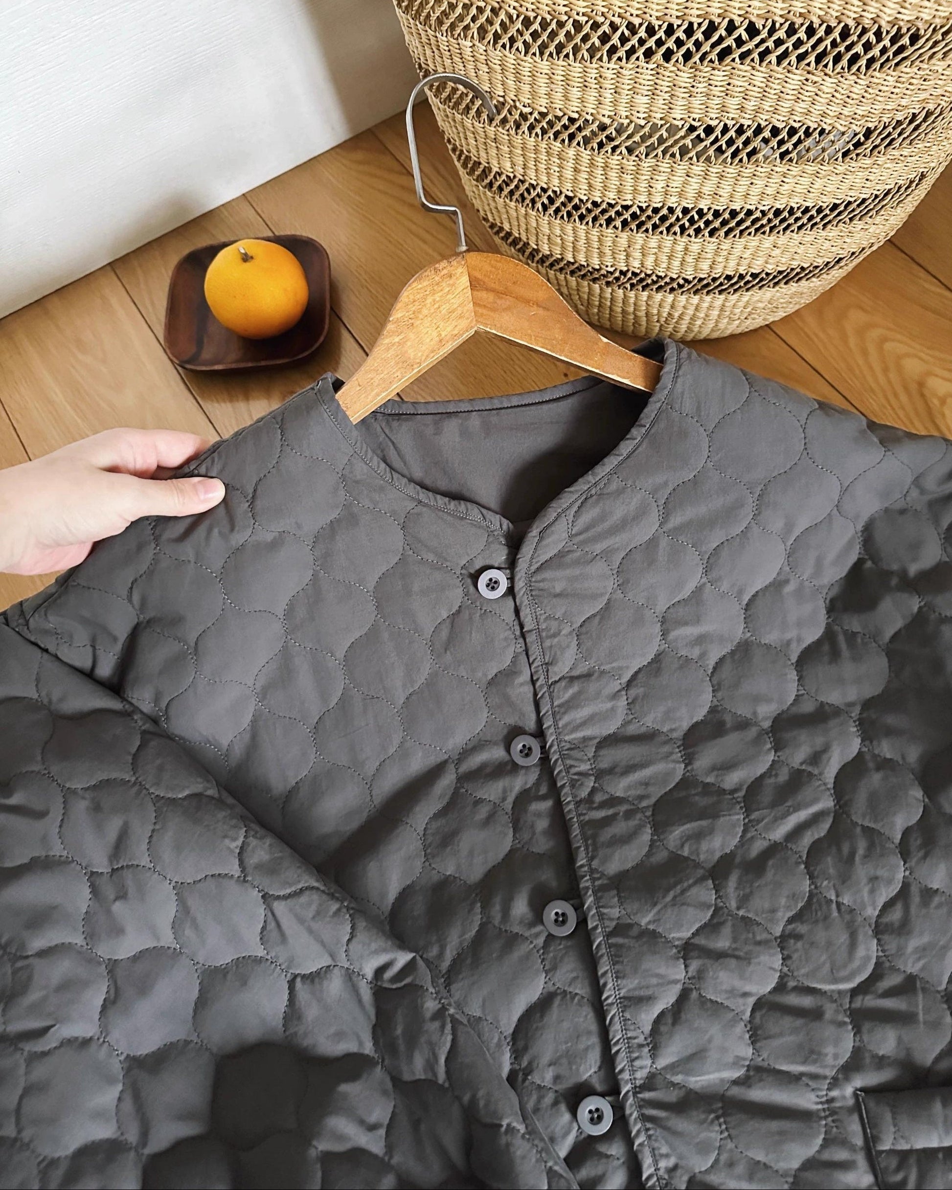 柔らかいコットン素材を使用し、エレガントさと快適さを兼ね備えた立体的なキルティングデザインが特徴です。温かみのあるダークグレーは、カジュアルからフォーマルなシーンまで幅広く活躍。大きなポケットとボタンデザインが、機能性とスタイルを引き立てます。季節を問わず使いやすく、日常のコーディネートにも最適な一着です。