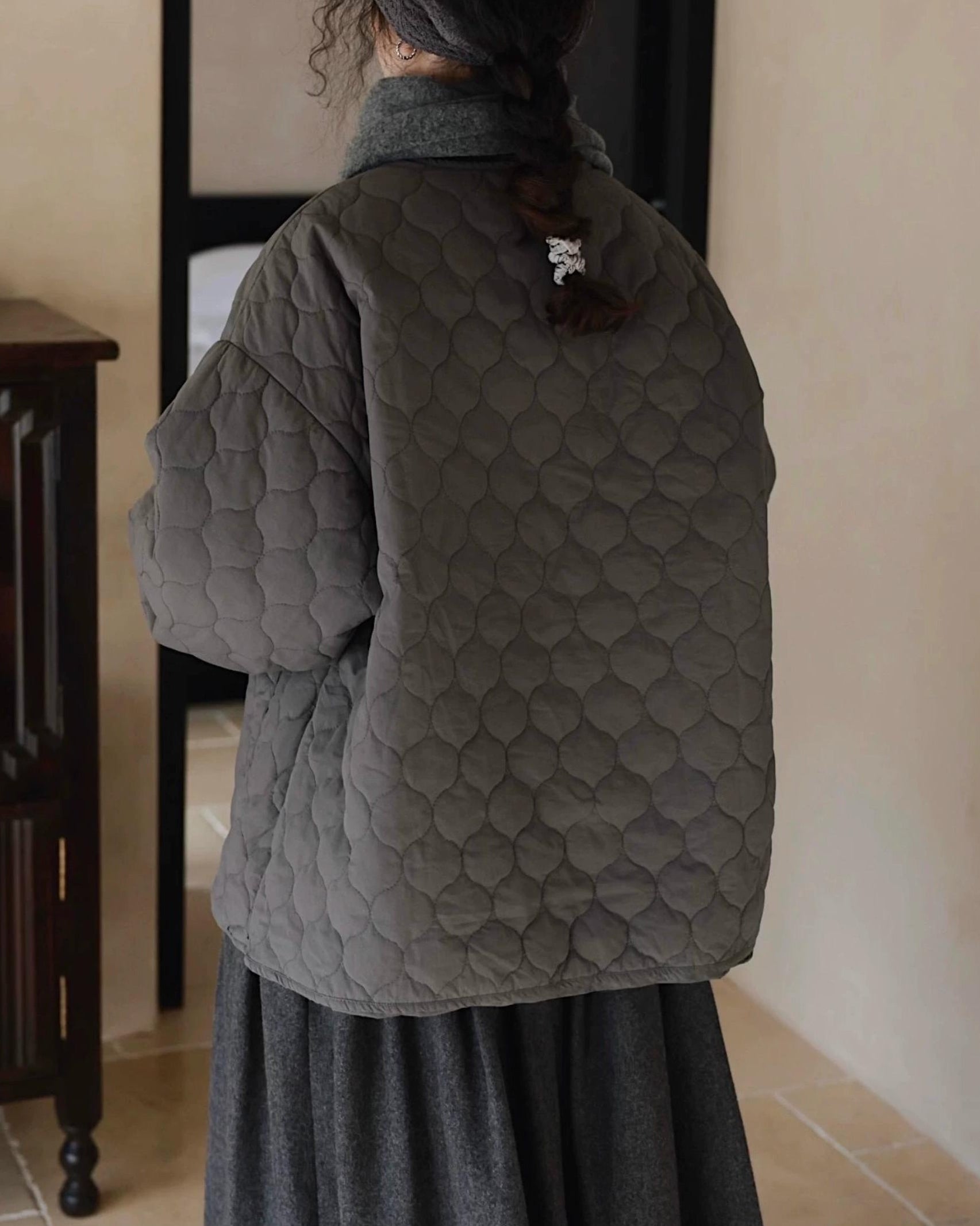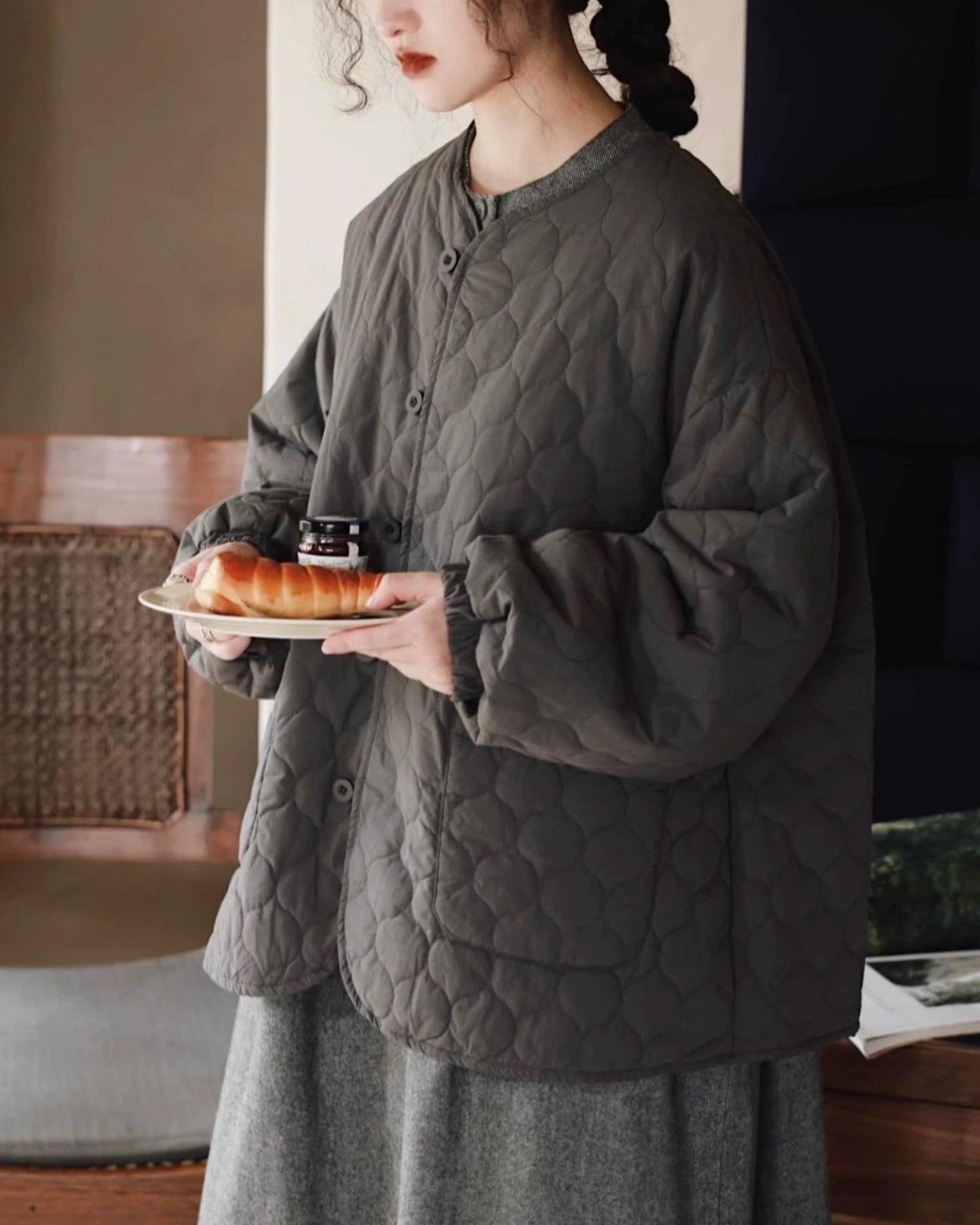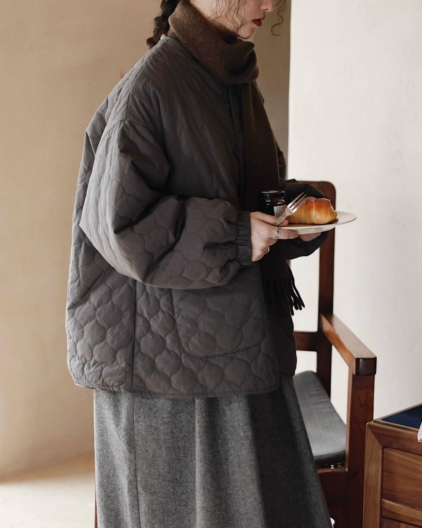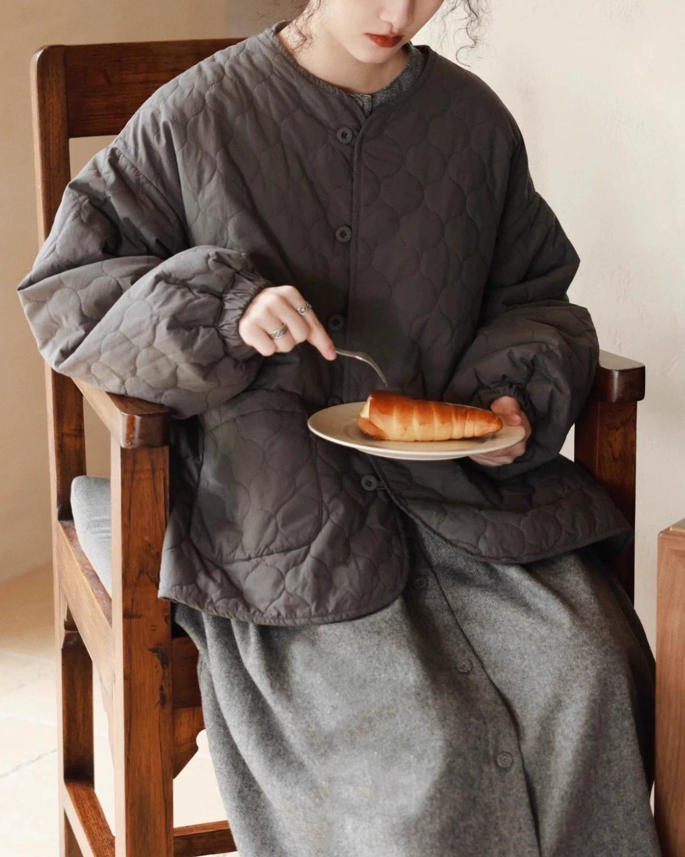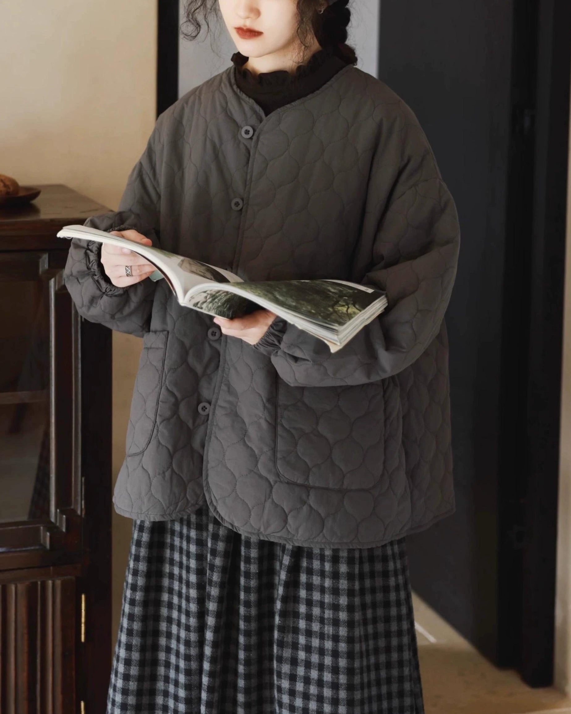 柔らかいコットン素材を使用し、エレガントさと快適さを兼ね備えた立体的なキルティングデザインが特徴です。温かみのあるダークグレーは、カジュアルからフォーマルなシーンまで幅広く活躍。大きなポケットとボタンデザインが、機能性とスタイルを引き立てます。季節を問わず使いやすく、日常のコーディネートにも最適な一着です。