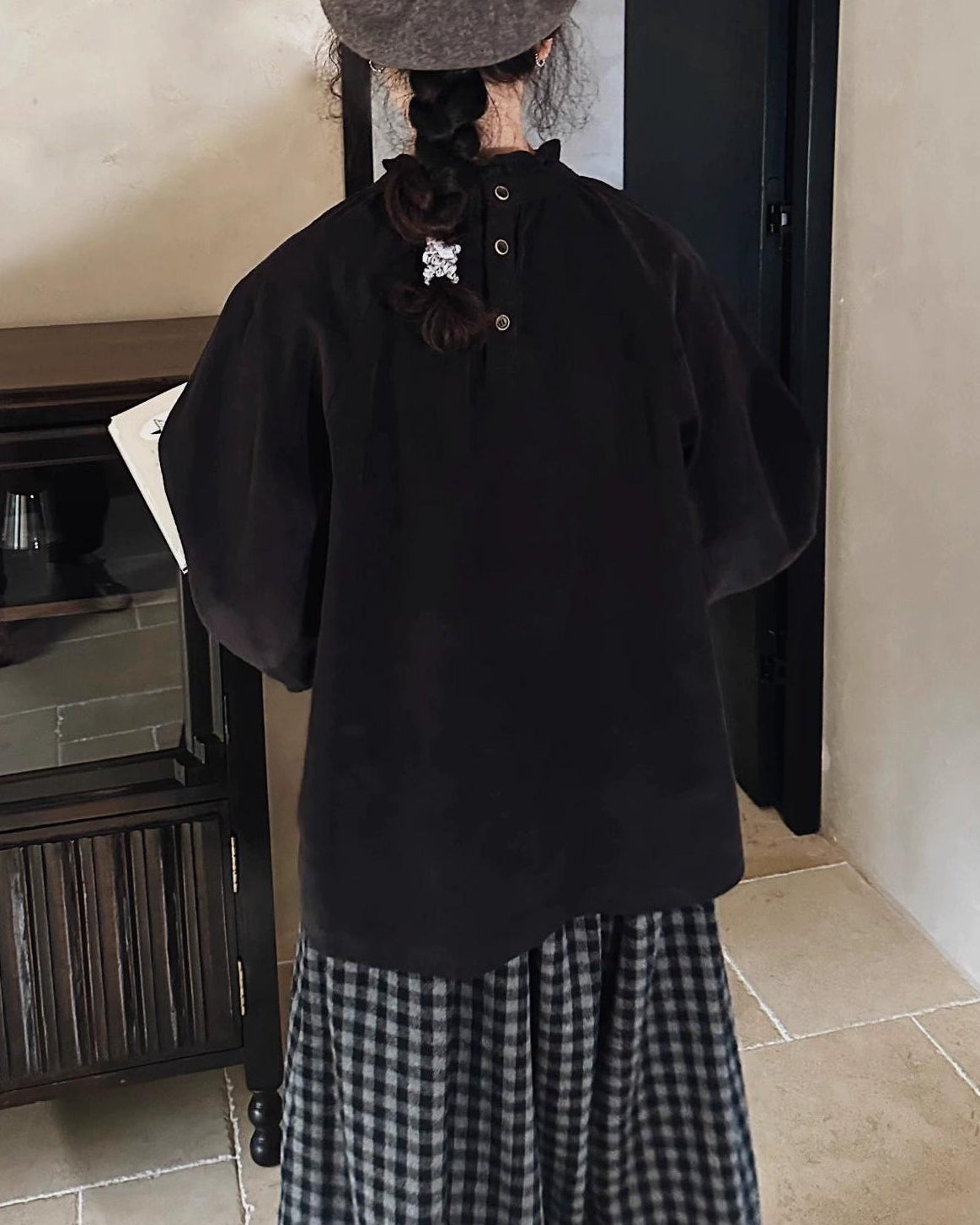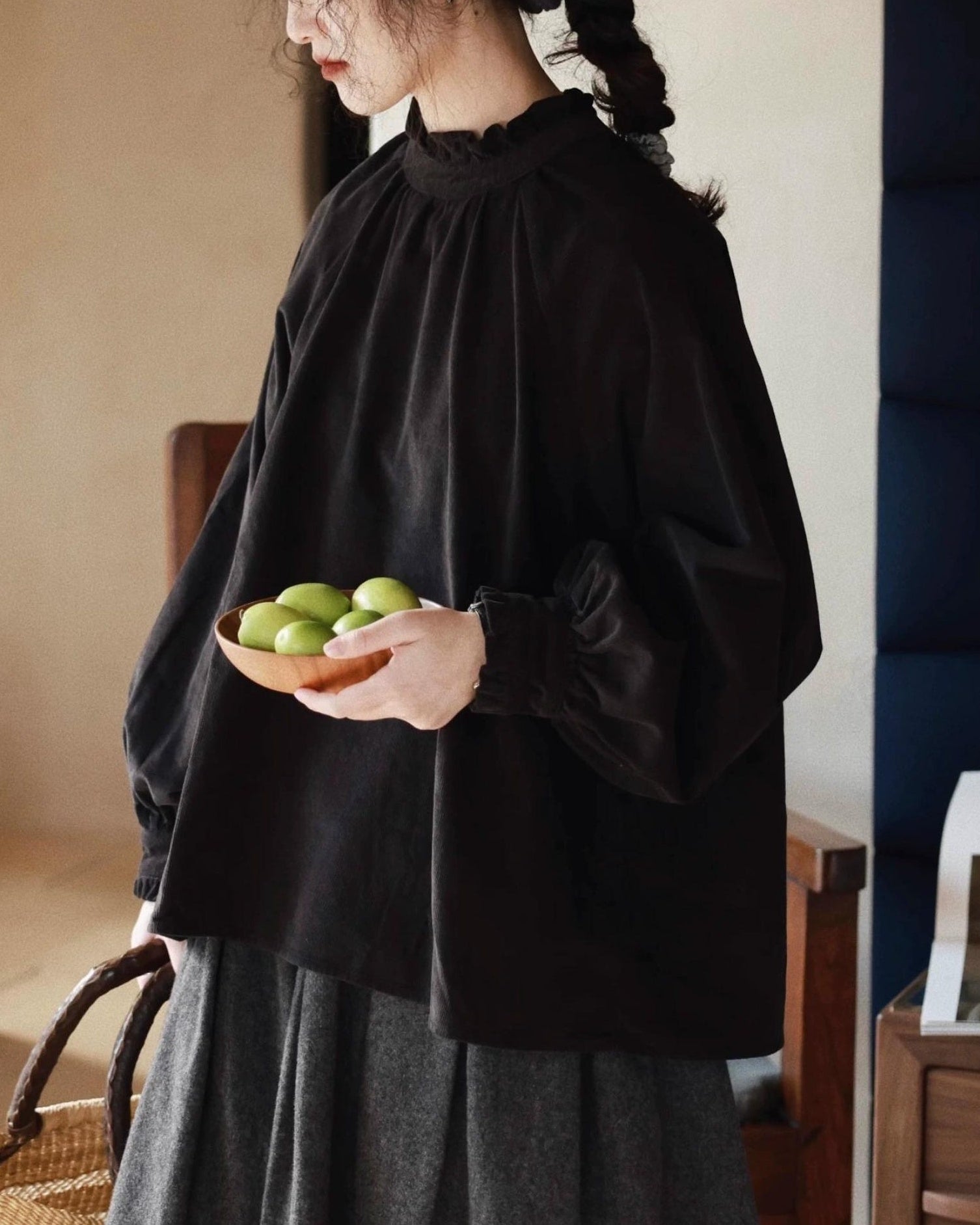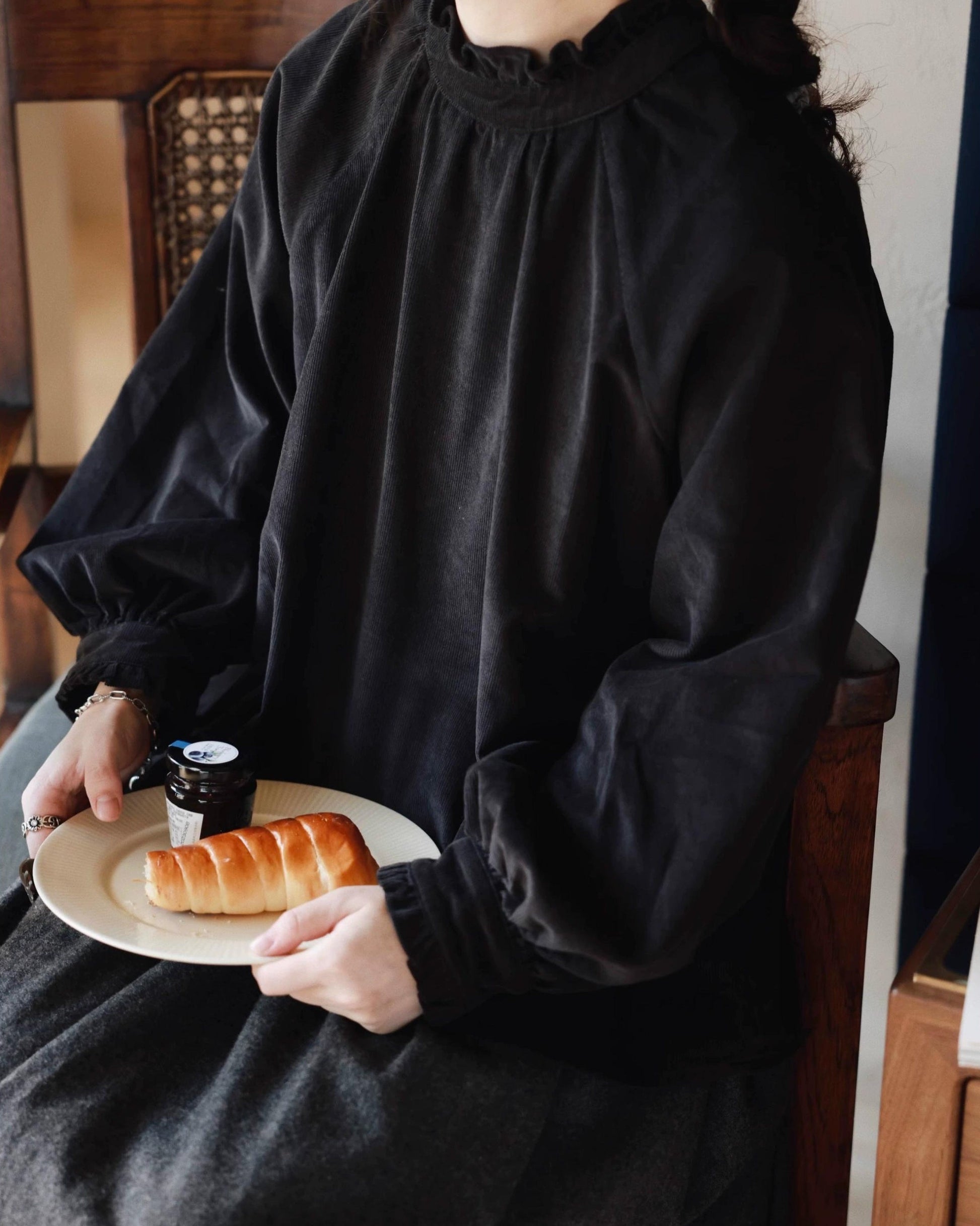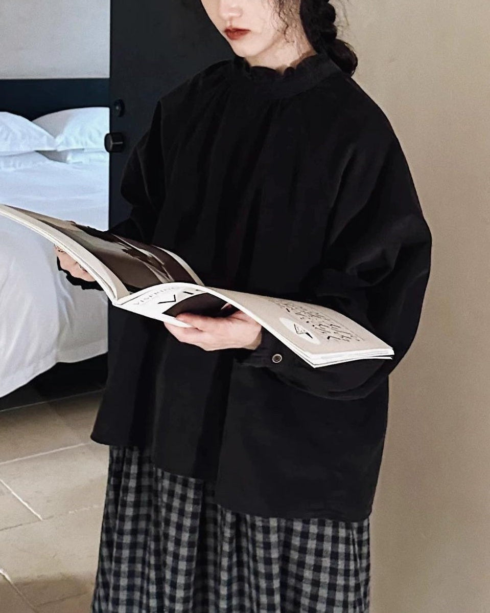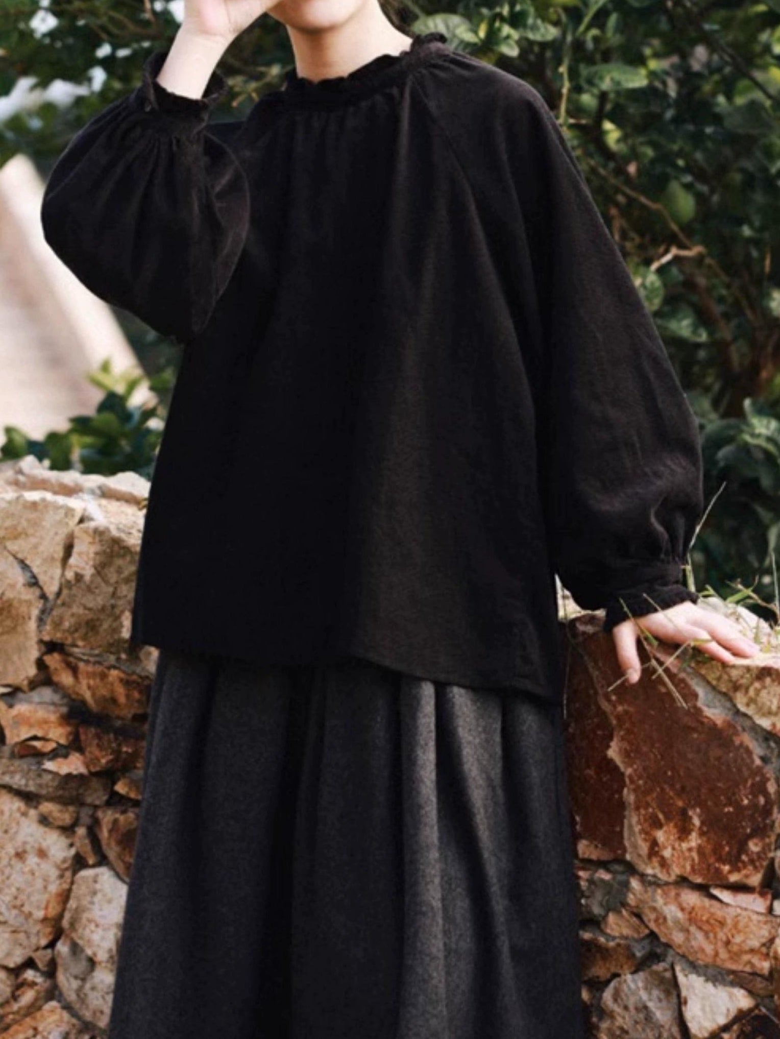 柔らかいコットン素材からなるレトロなフリルブラウス。落ち着いた黒色に、ラウンドカラーとボリューム感のあるスリーブが特徴で、アクセントに完璧なフリルが施されています。さまざまなシーンで着回しでき、デイリーコーデにぴったりな一着です。