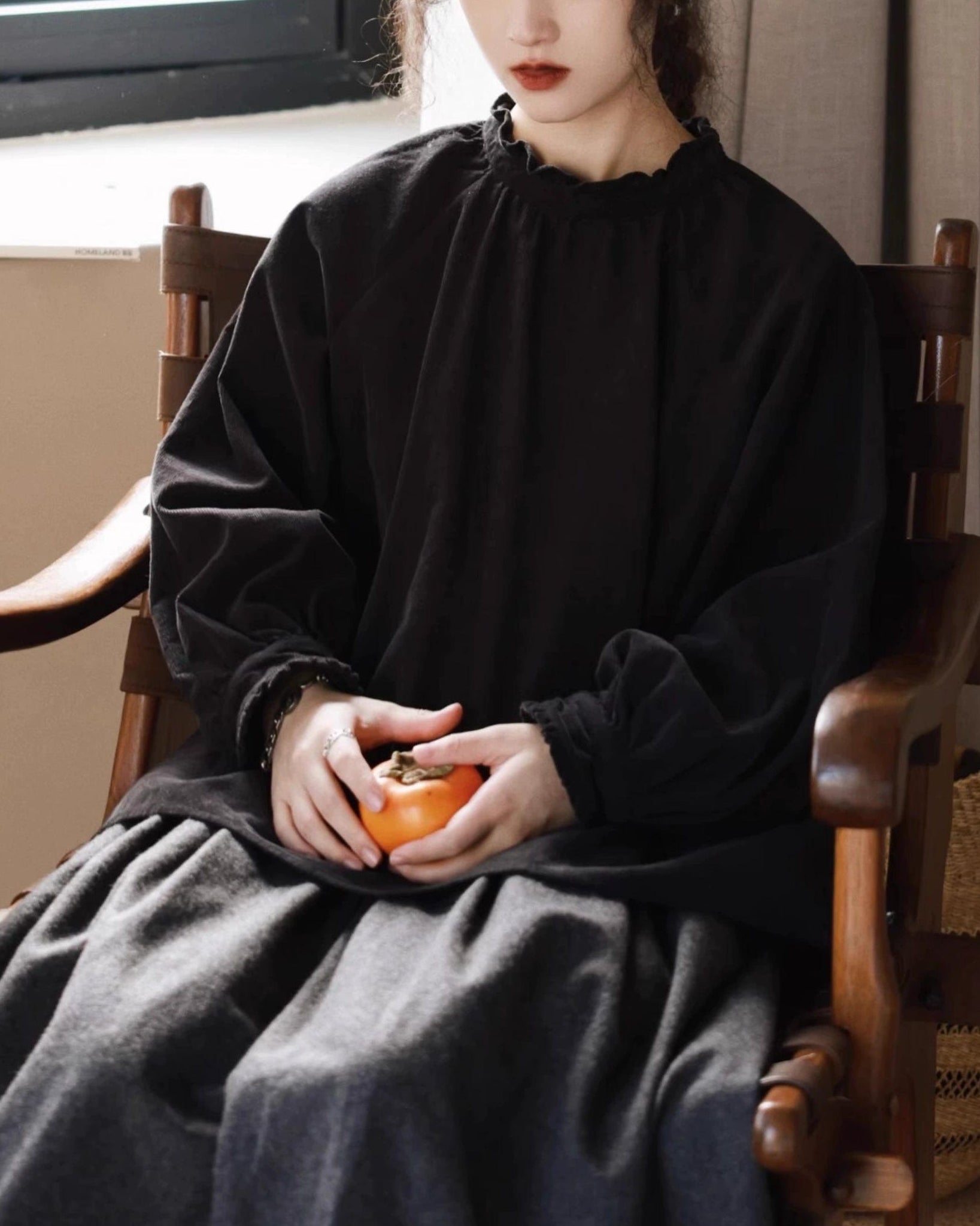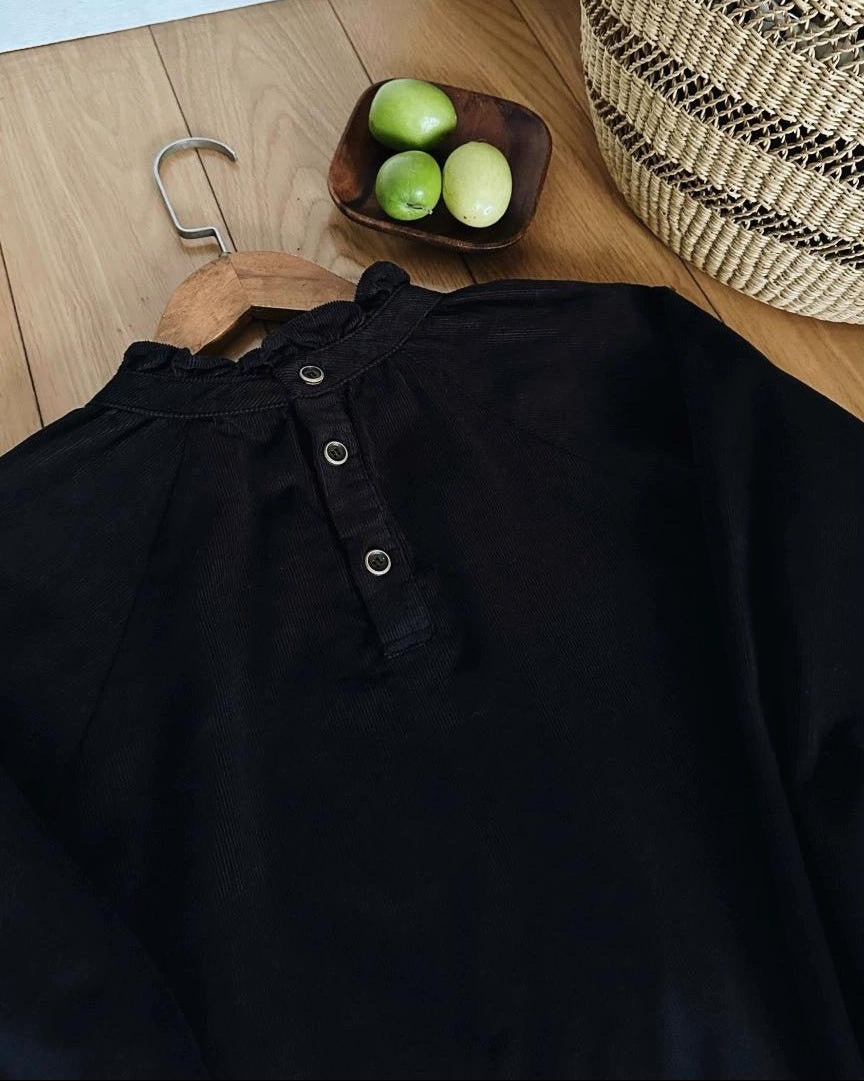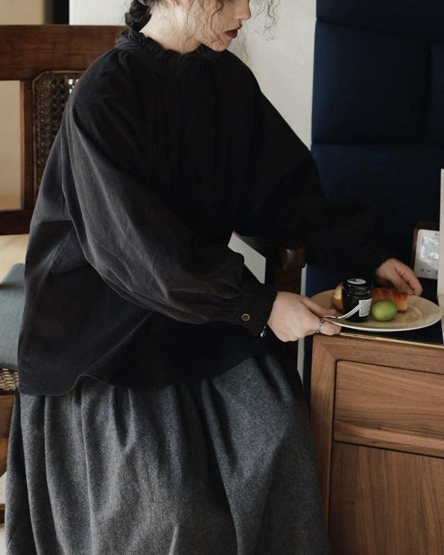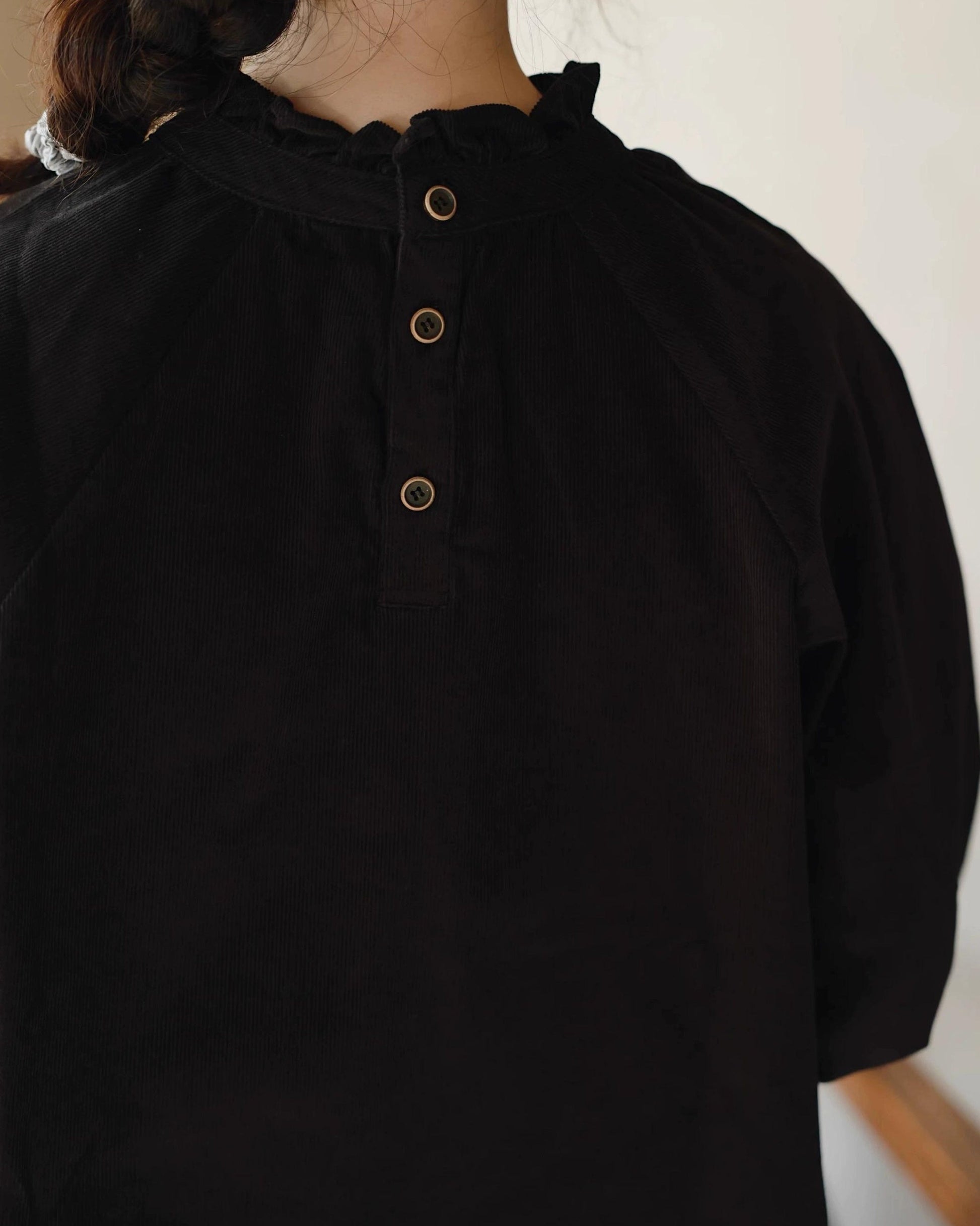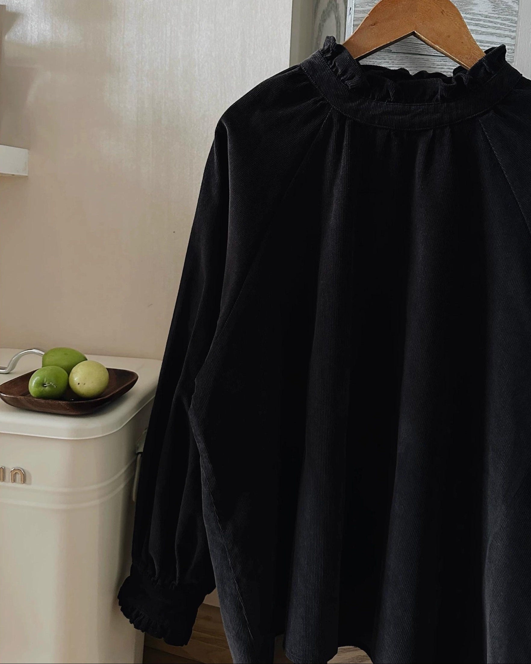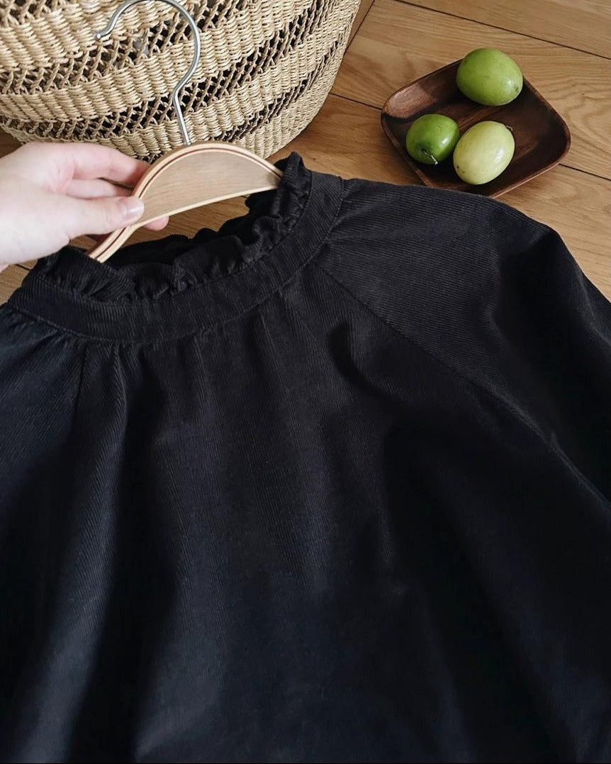 柔らかいコットン素材からなるレトロなフリルブラウス。落ち着いた黒色に、ラウンドカラーとボリューム感のあるスリーブが特徴で、アクセントに完璧なフリルが施されています。さまざまなシーンで着回しでき、デイリーコーデにぴったりな一着です。