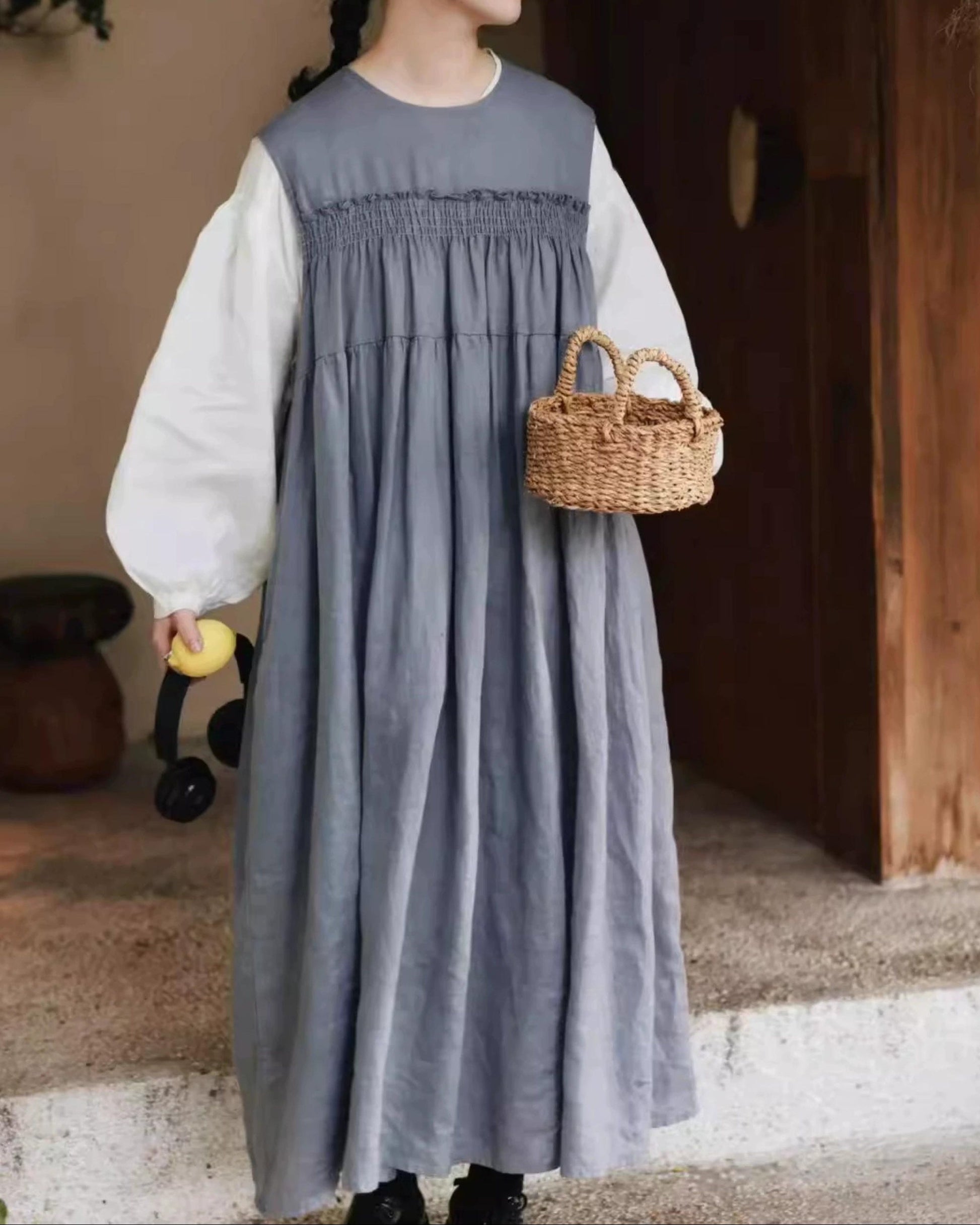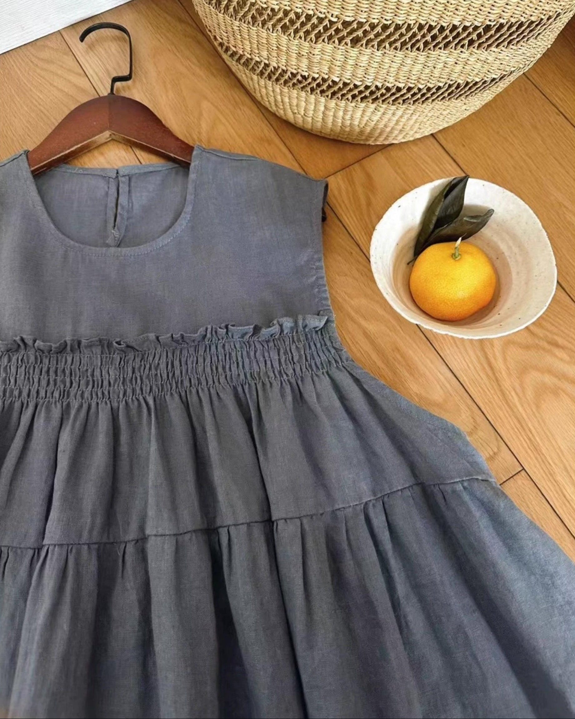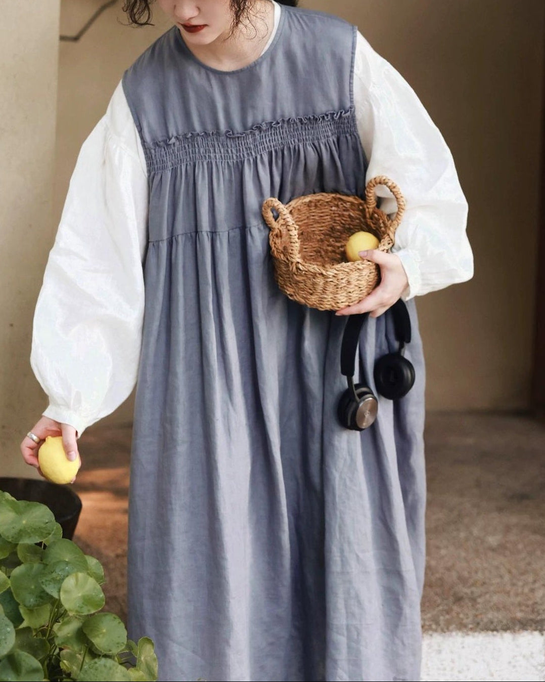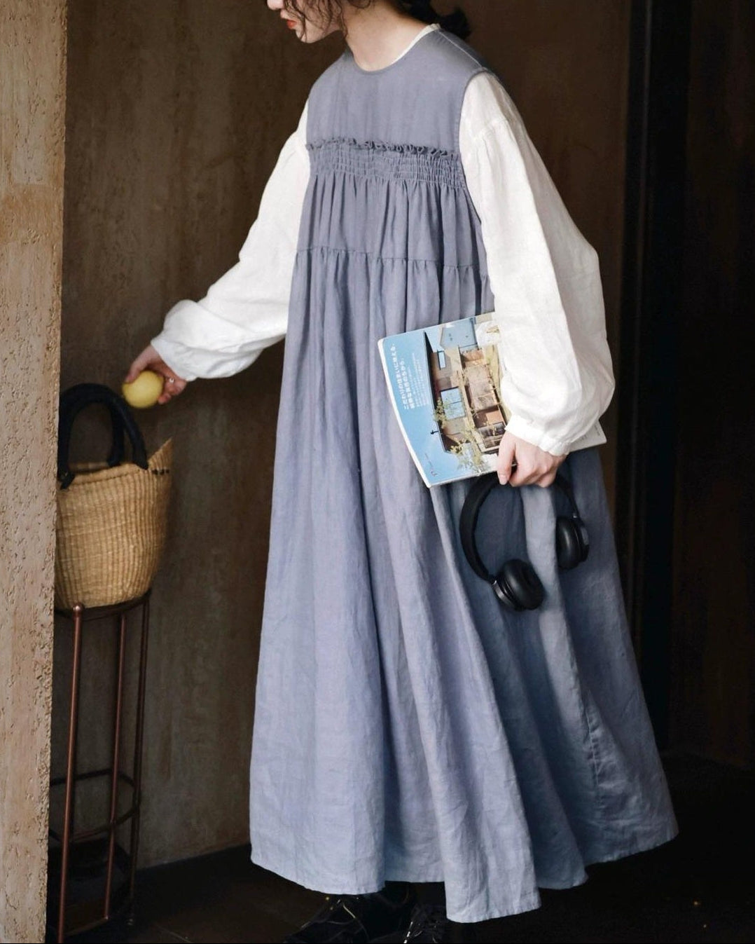 軽やかなリネン素材を使用し、流れるようなシルエットが魅力のハイウエストドレス。フリルディテールと女性らしい丸首デザインが印象的で、カジュアルな日常使いから特別なシーンまで幅広く活躍します。ナチュラルなグレーのトーンが上品で、重ね着にも最適。