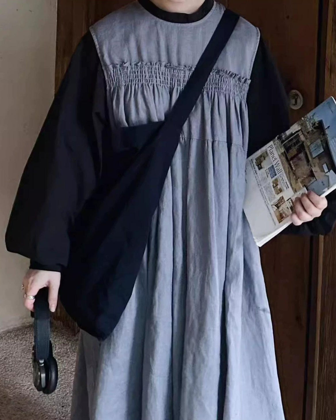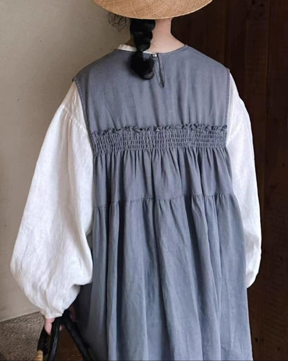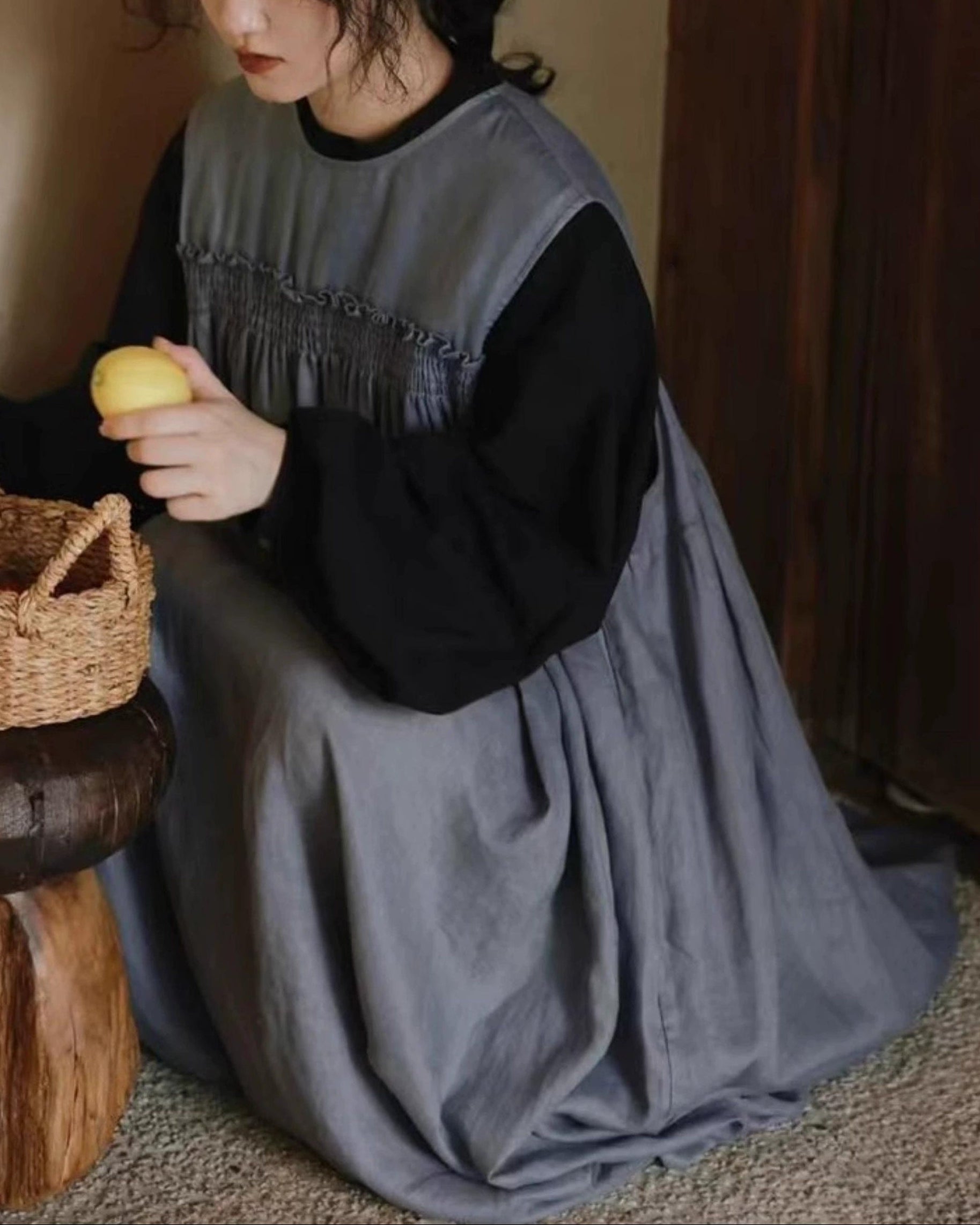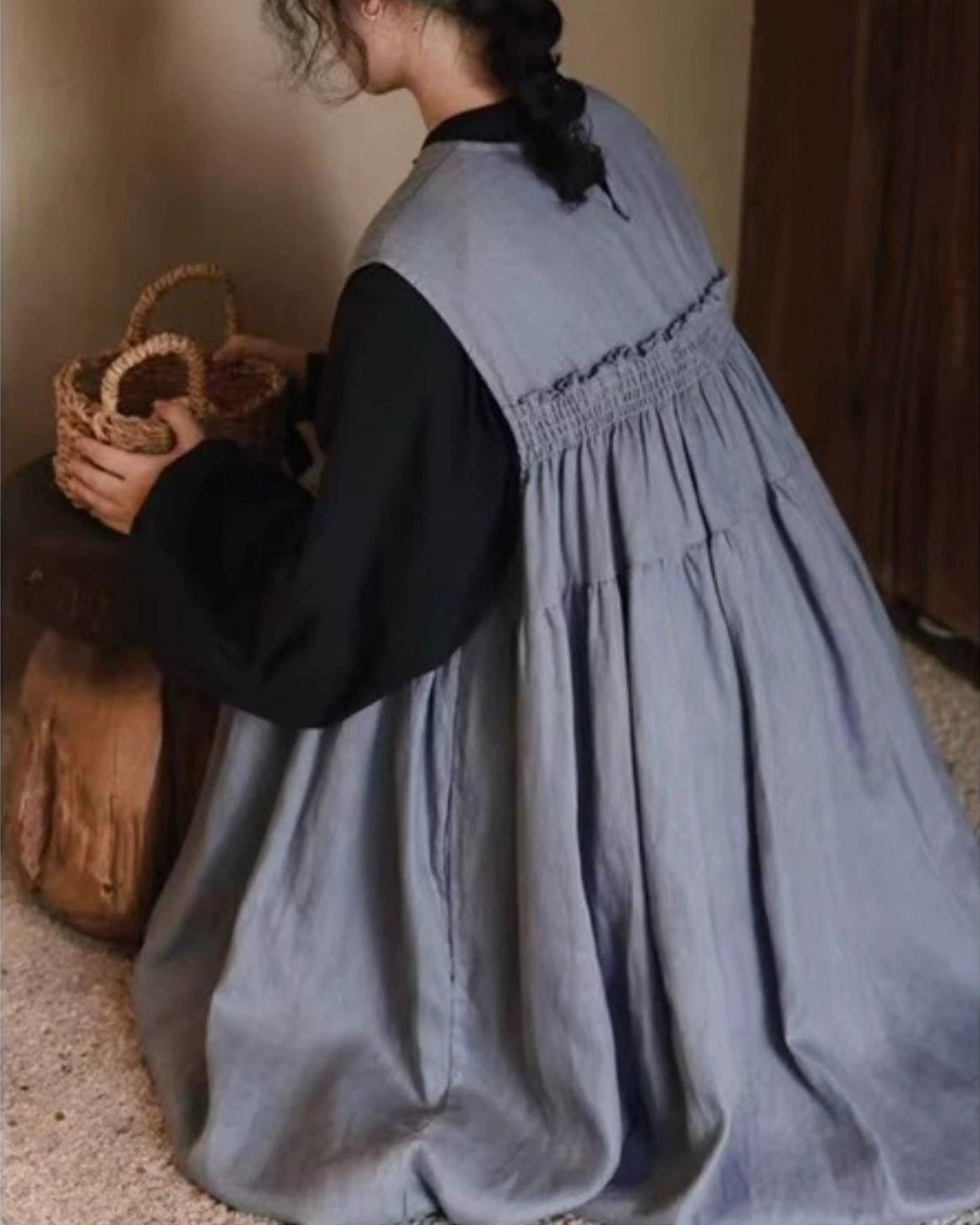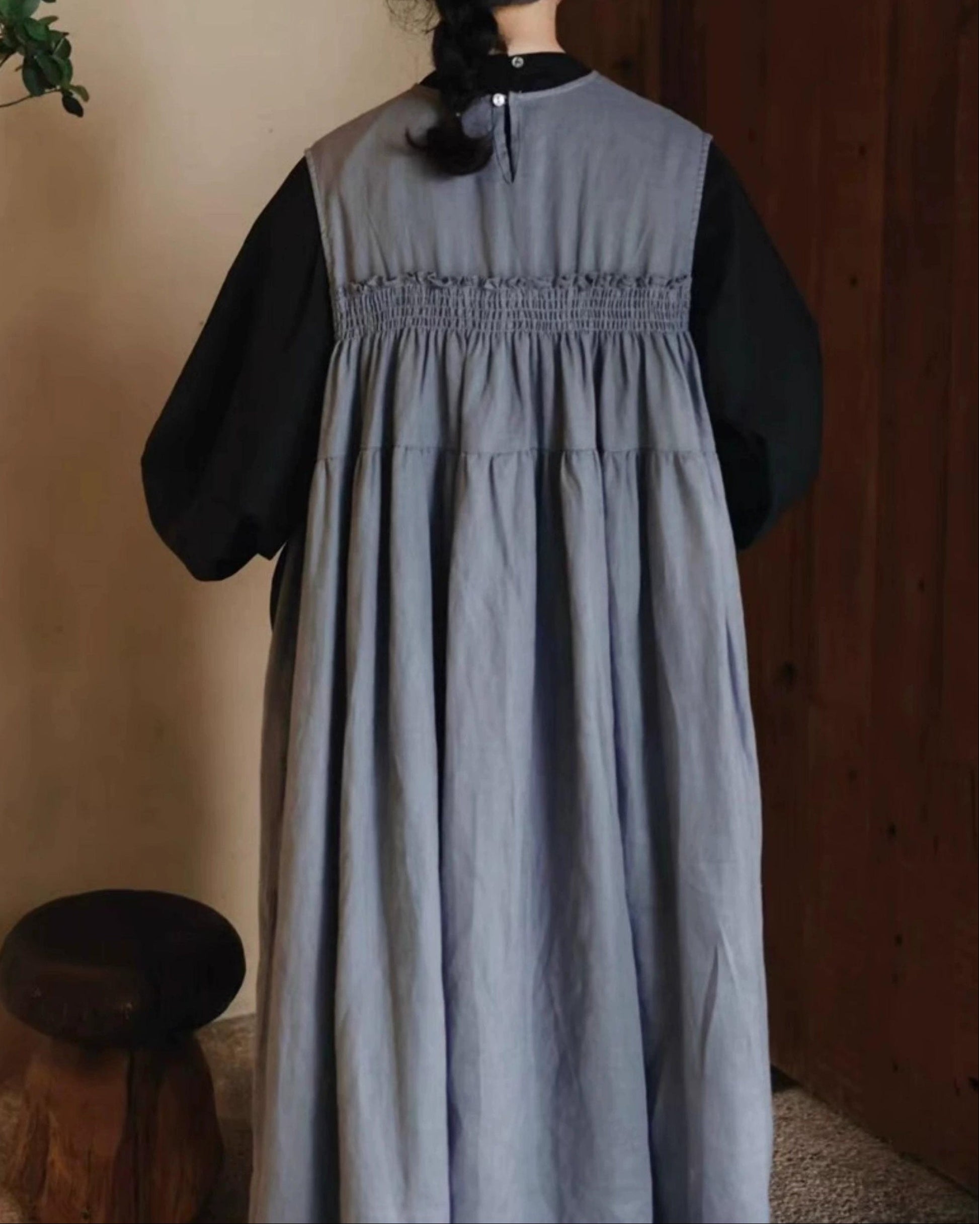 軽やかなリネン素材を使用し、流れるようなシルエットが魅力のハイウエストドレス。フリルディテールと女性らしい丸首デザインが印象的で、カジュアルな日常使いから特別なシーンまで幅広く活躍します。ナチュラルなグレーのトーンが上品で、重ね着にも最適。