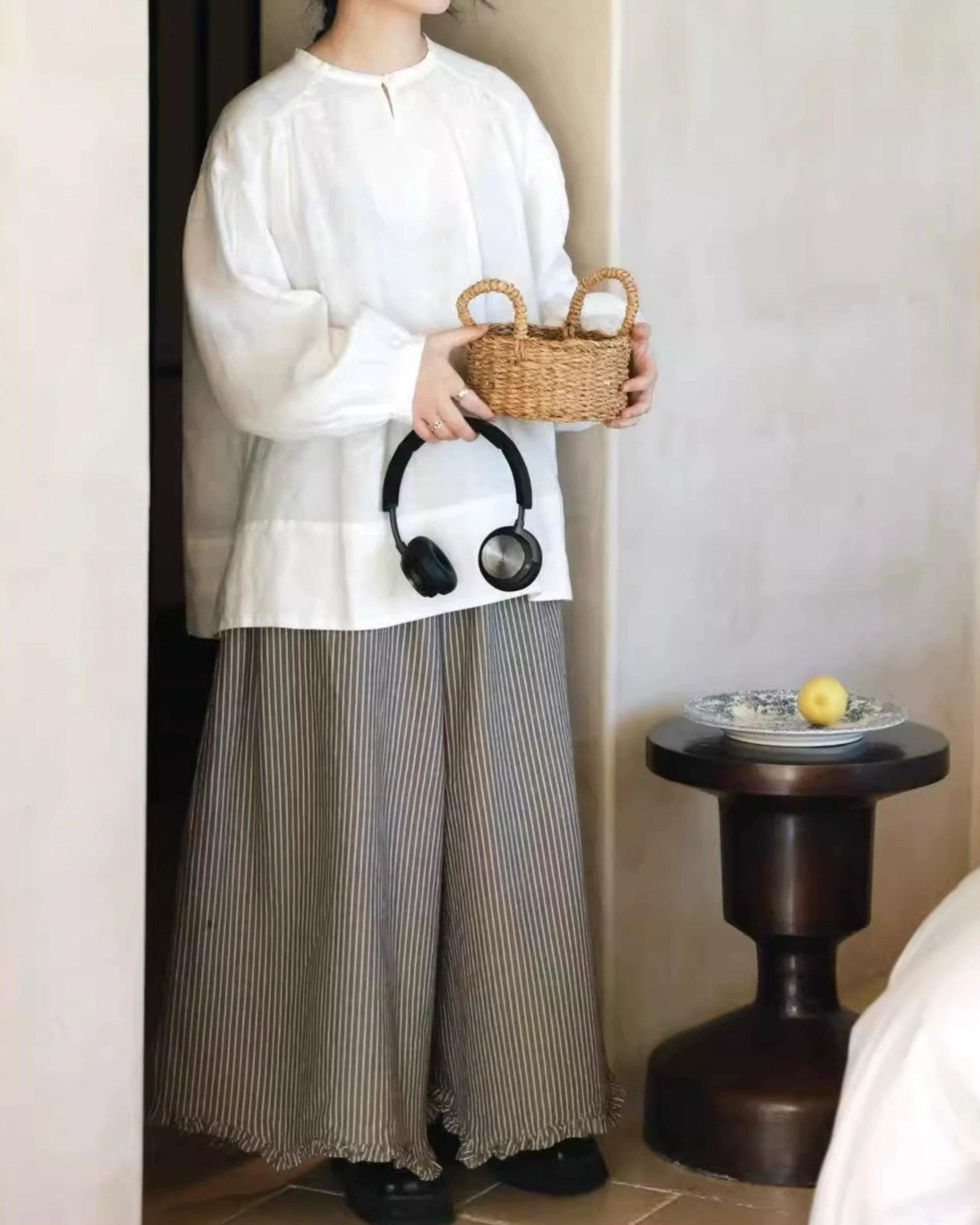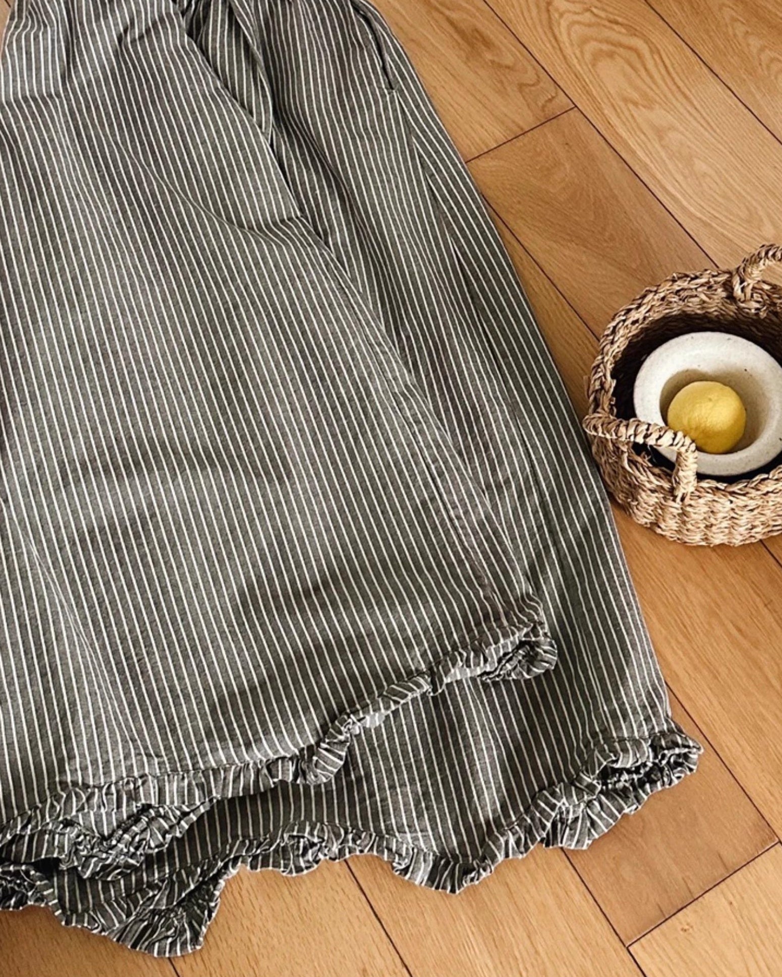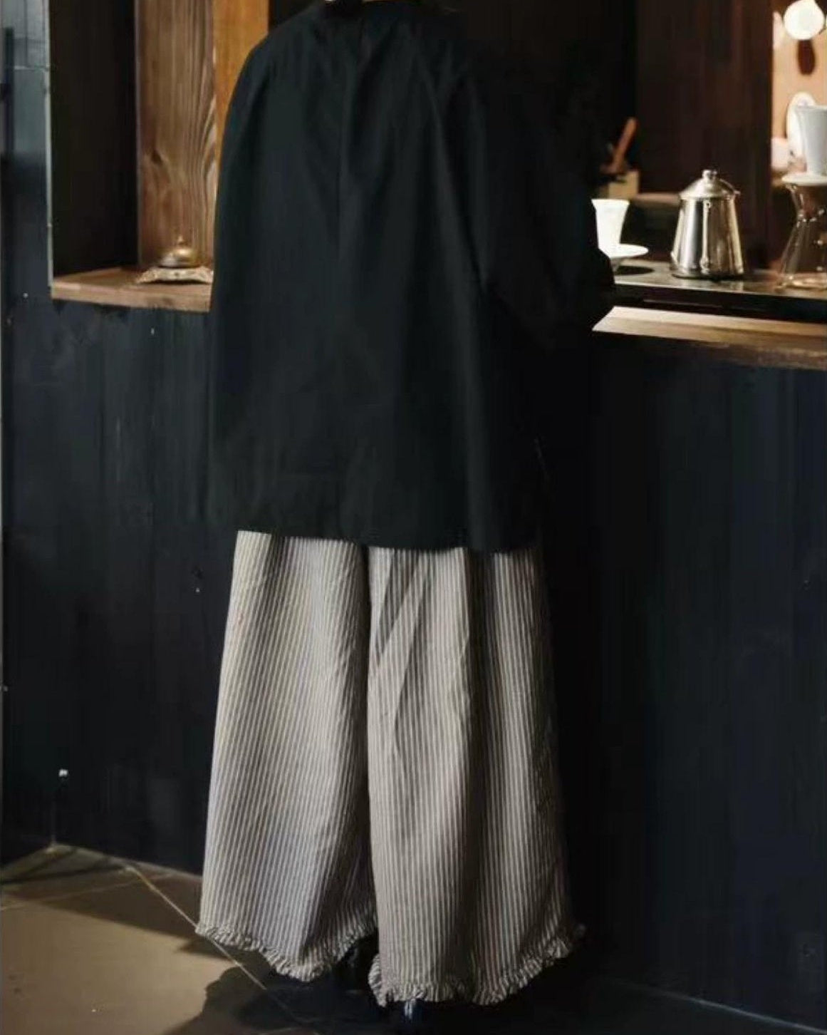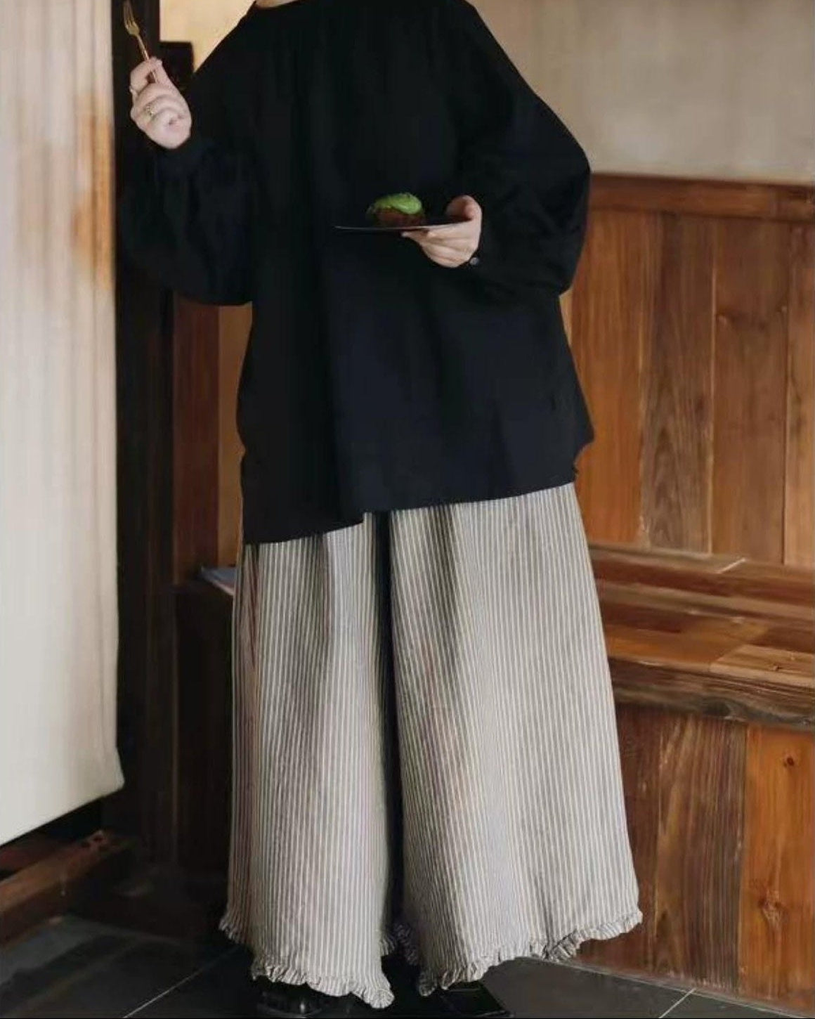 おしゃれでリラックス感漂うハイウエストワイドパンツ。滑らかなコットン素材と独特なストライプ柄が際立ち、裾にはふんわりとしたフリルが特徴。カジュアルにもフォーマルにも対応可能で、さまざまなシーンで活躍します。大人の女性にぴったりな一着です。