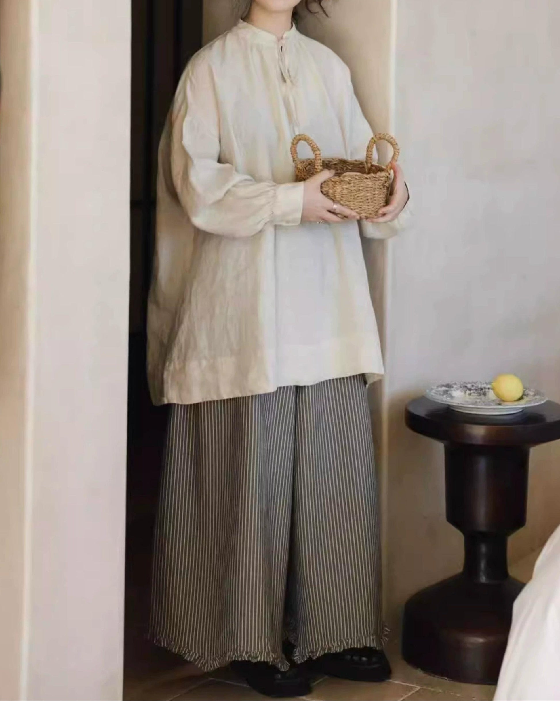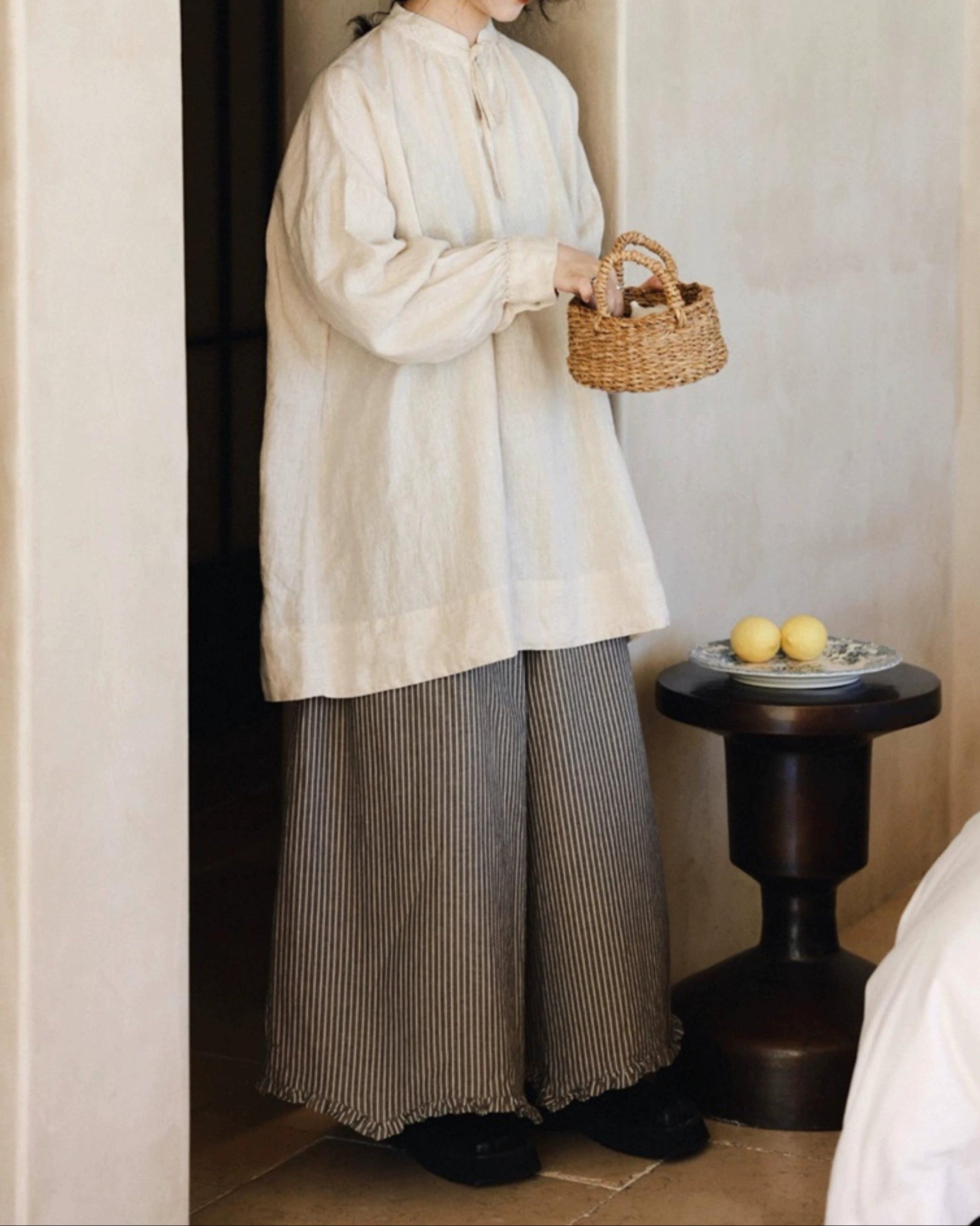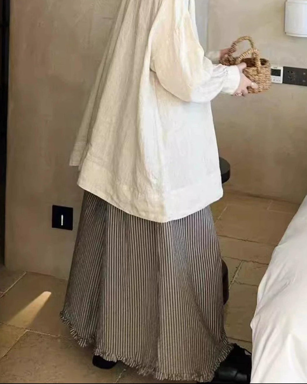 おしゃれでリラックス感漂うハイウエストワイドパンツ。滑らかなコットン素材と独特なストライプ柄が際立ち、裾にはふんわりとしたフリルが特徴。カジュアルにもフォーマルにも対応可能で、さまざまなシーンで活躍します。大人の女性にぴったりな一着です。