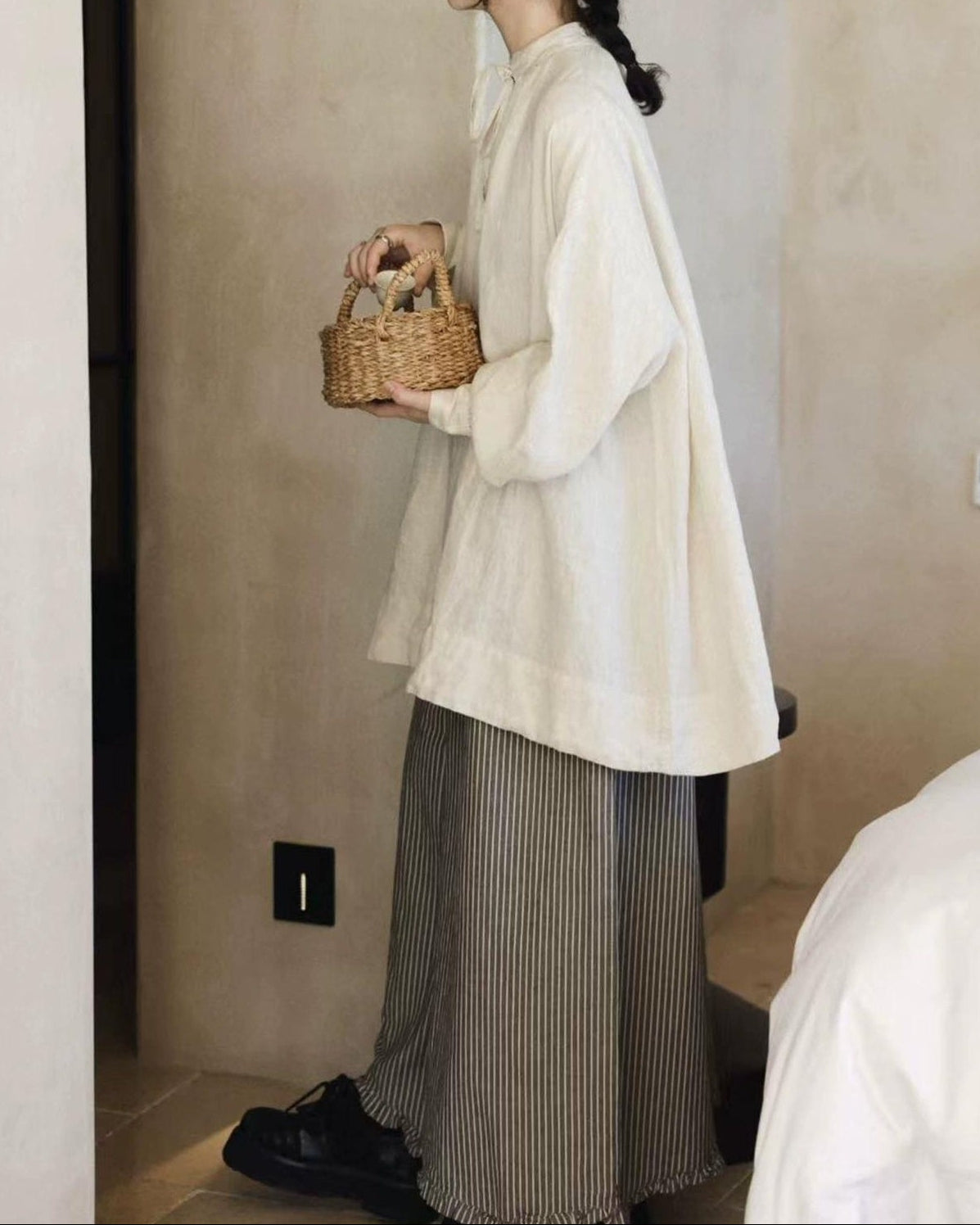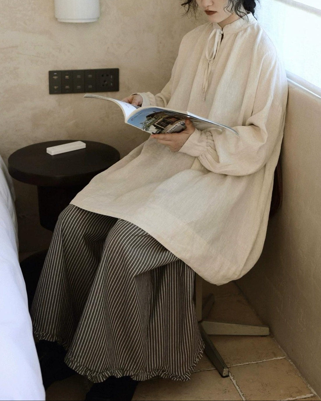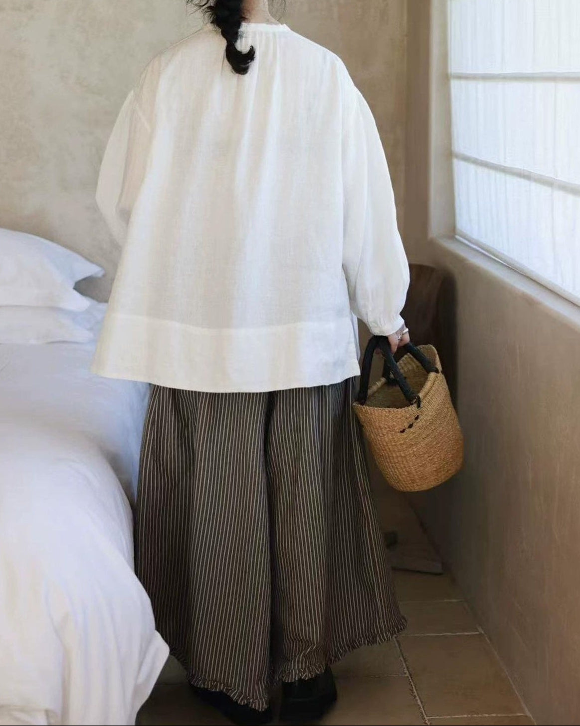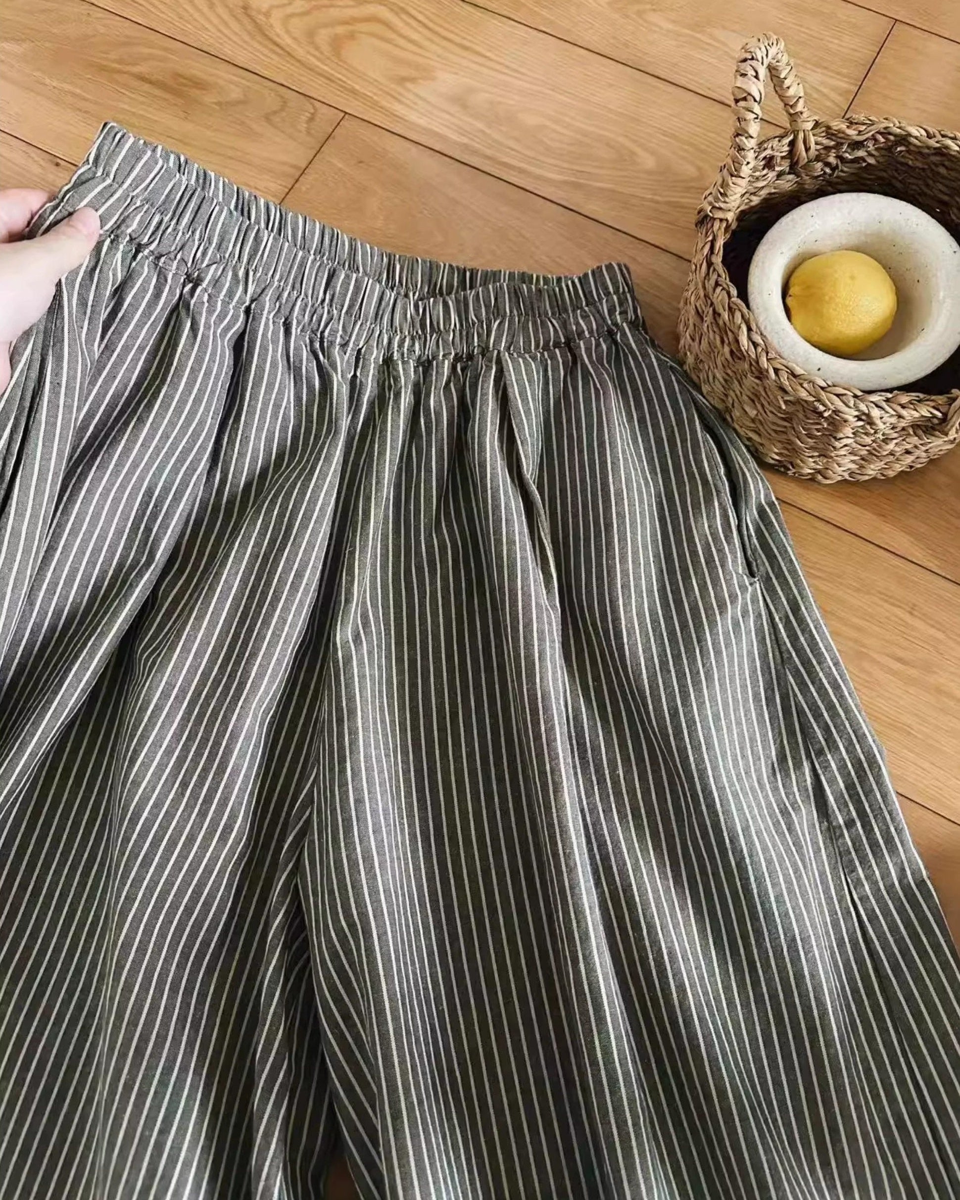 おしゃれでリラックス感漂うハイウエストワイドパンツ。滑らかなコットン素材と独特なストライプ柄が際立ち、裾にはふんわりとしたフリルが特徴。カジュアルにもフォーマルにも対応可能で、さまざまなシーンで活躍します。大人の女性にぴったりな一着です。