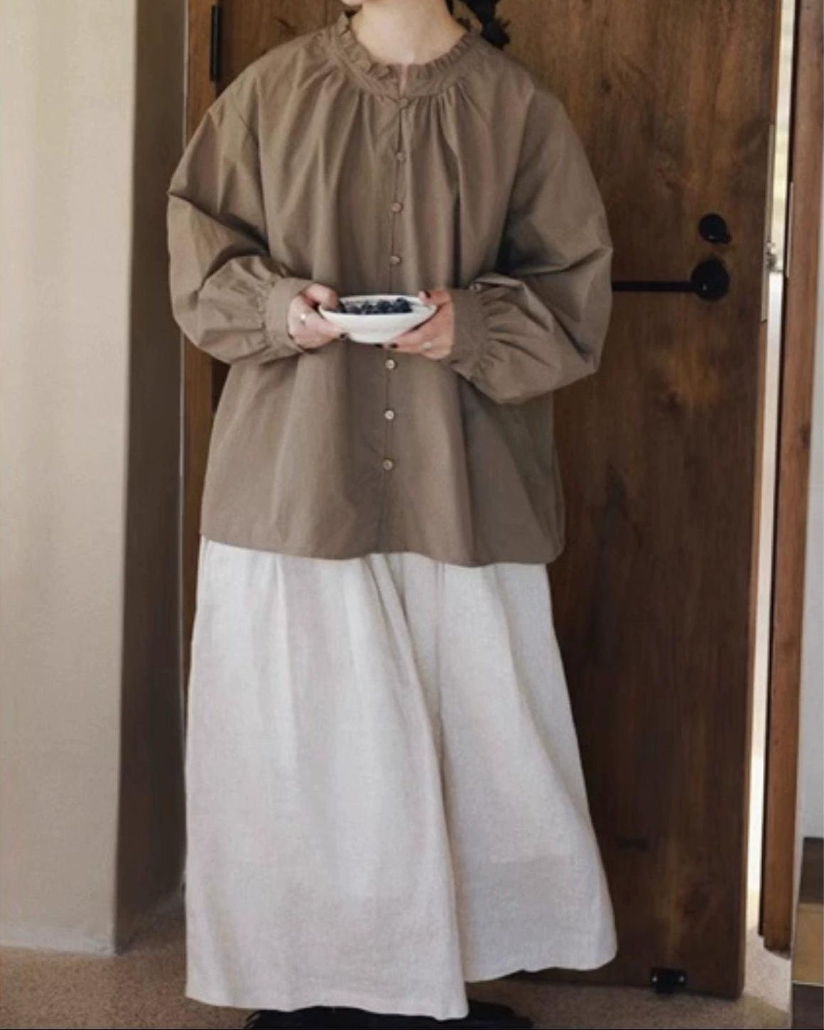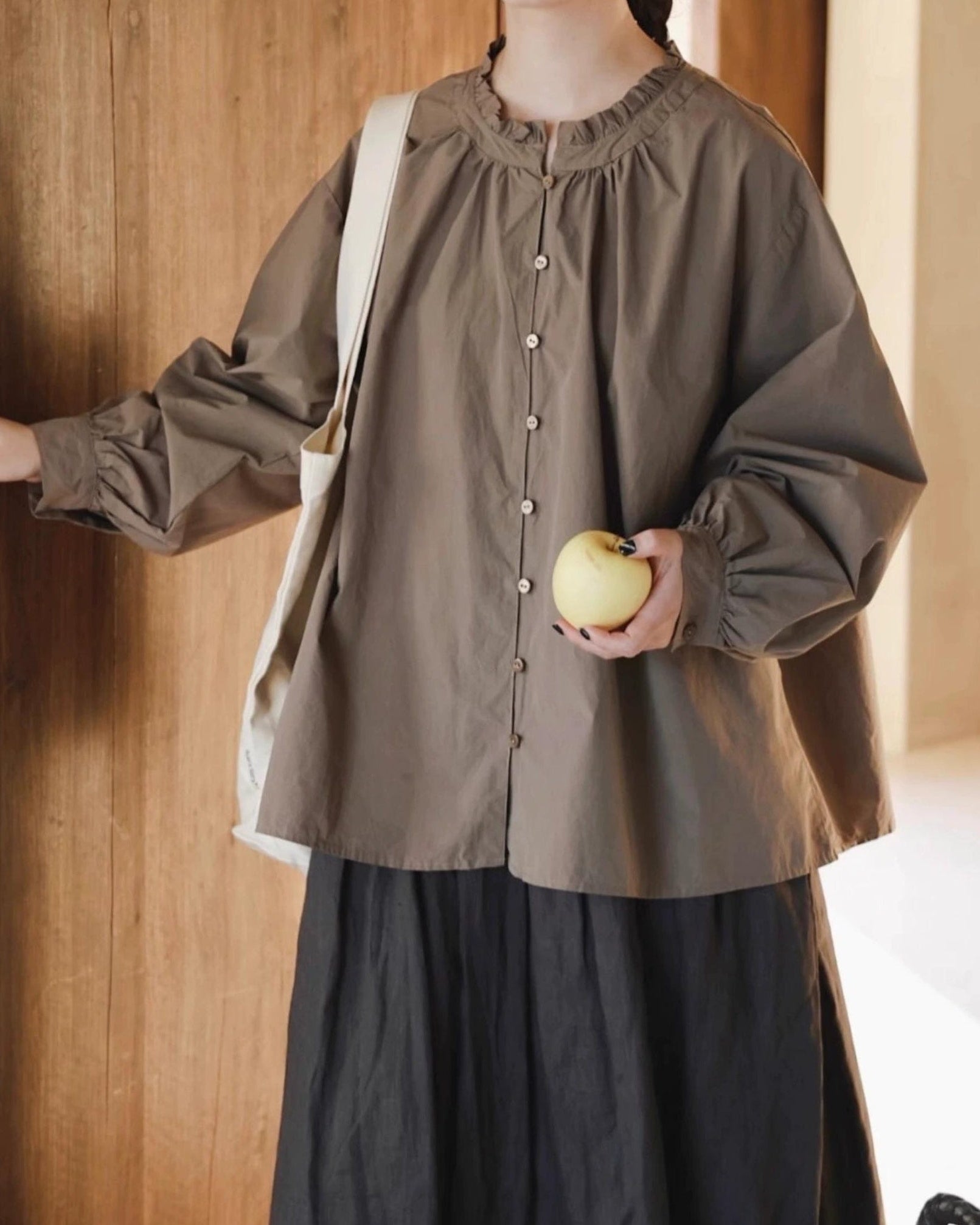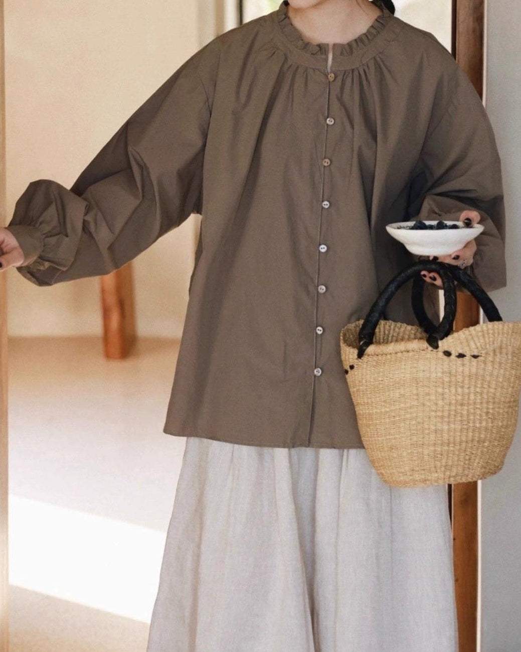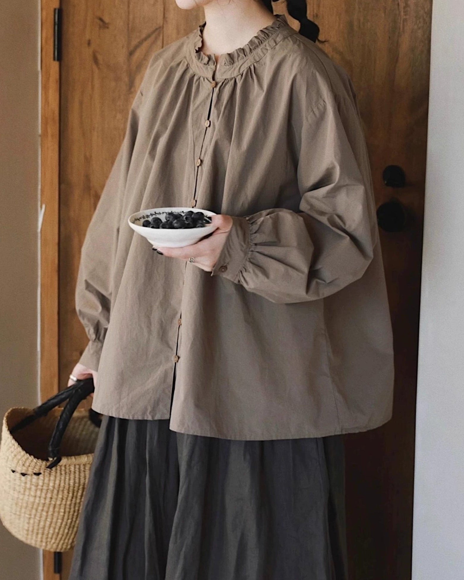 柔らかなモカ色のコットン素材を使用したブラウス。特徴的なフリルの襟と、丸みを帯びたシルエットで優しい印象を与えます。ボリュームのある袖がカジュアルでありながらも洗練さを演出。季節を問わず、日常のコーディネートに取り入れやすい一枚です。