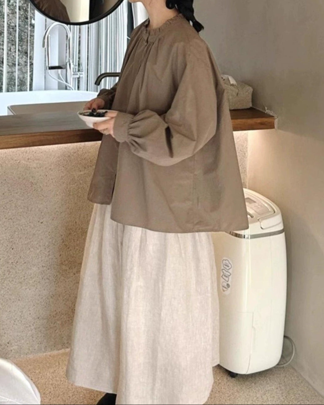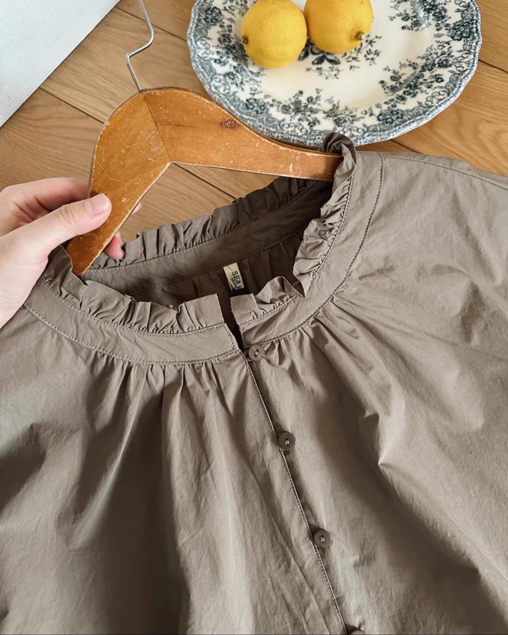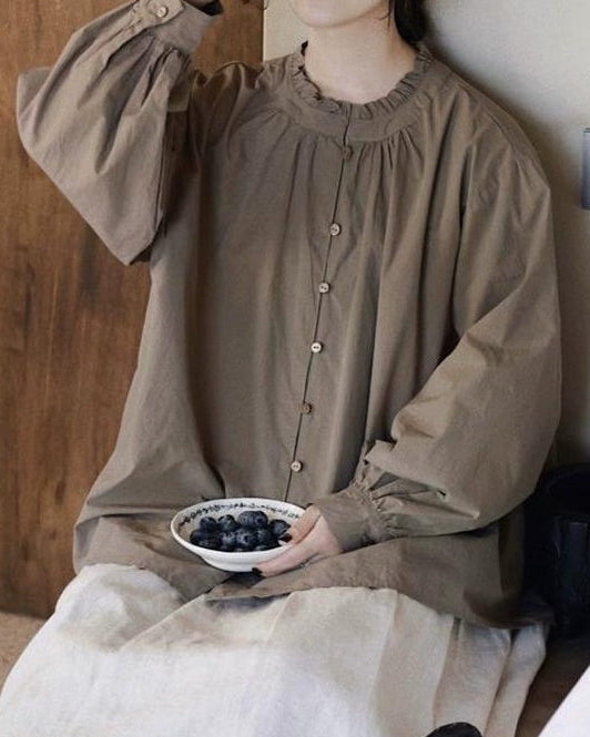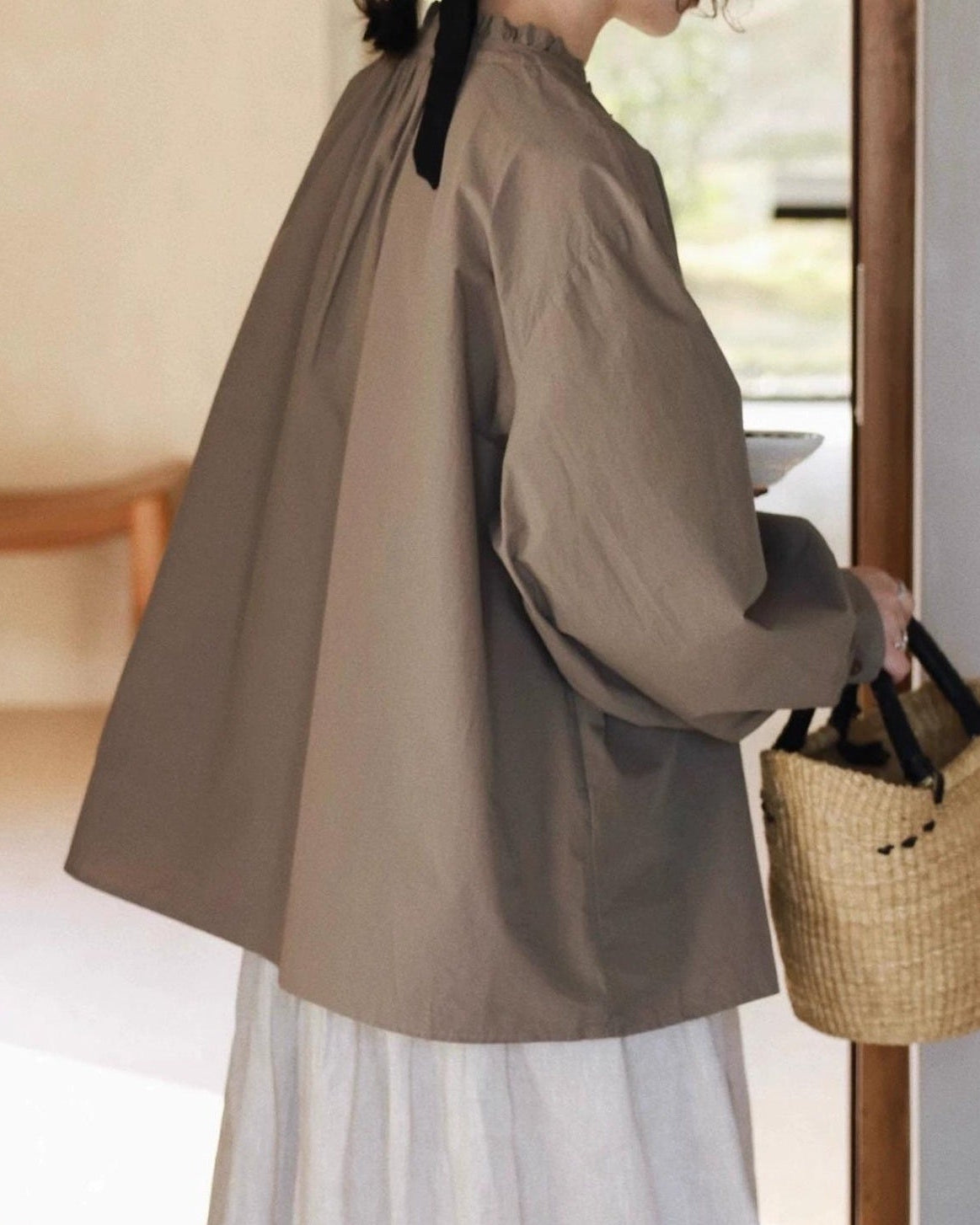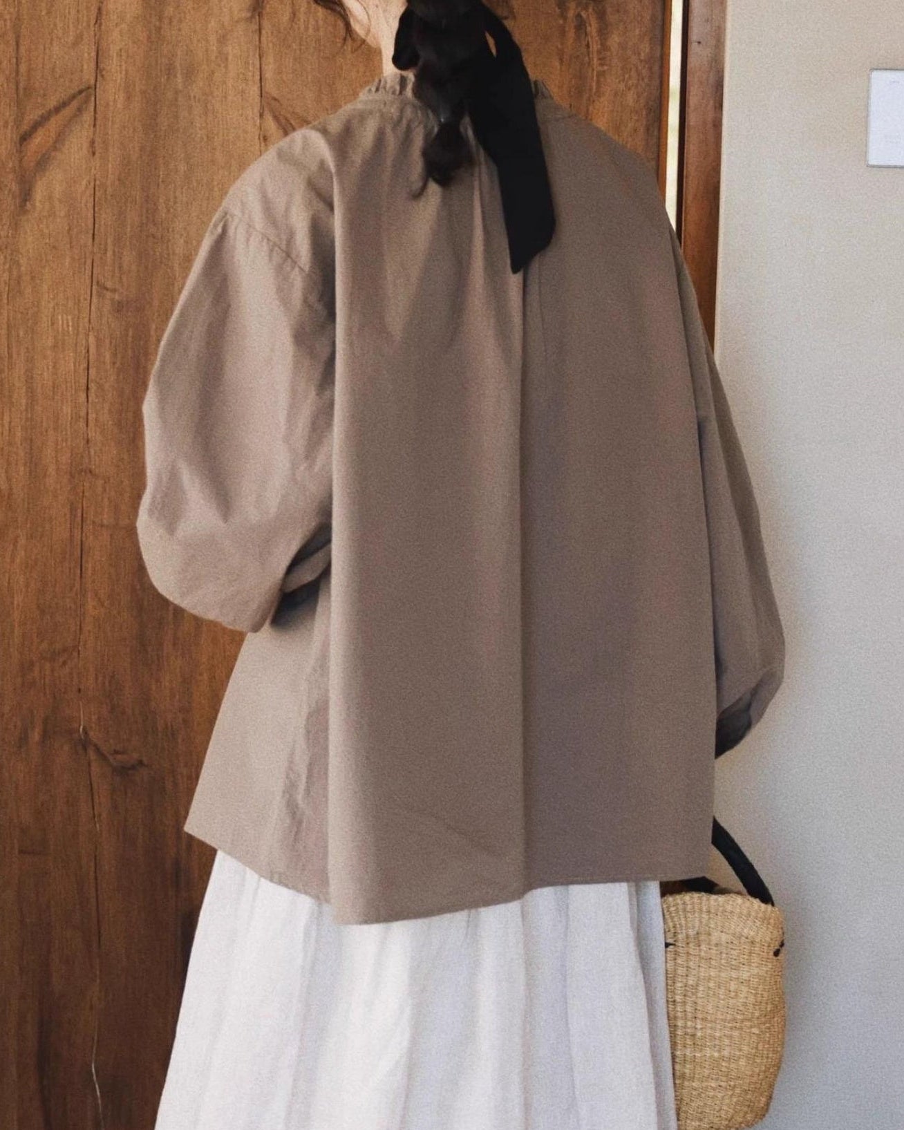 柔らかなモカ色のコットン素材を使用したブラウス。特徴的なフリルの襟と、丸みを帯びたシルエットで優しい印象を与えます。ボリュームのある袖がカジュアルでありながらも洗練さを演出。季節を問わず、日常のコーディネートに取り入れやすい一枚です。