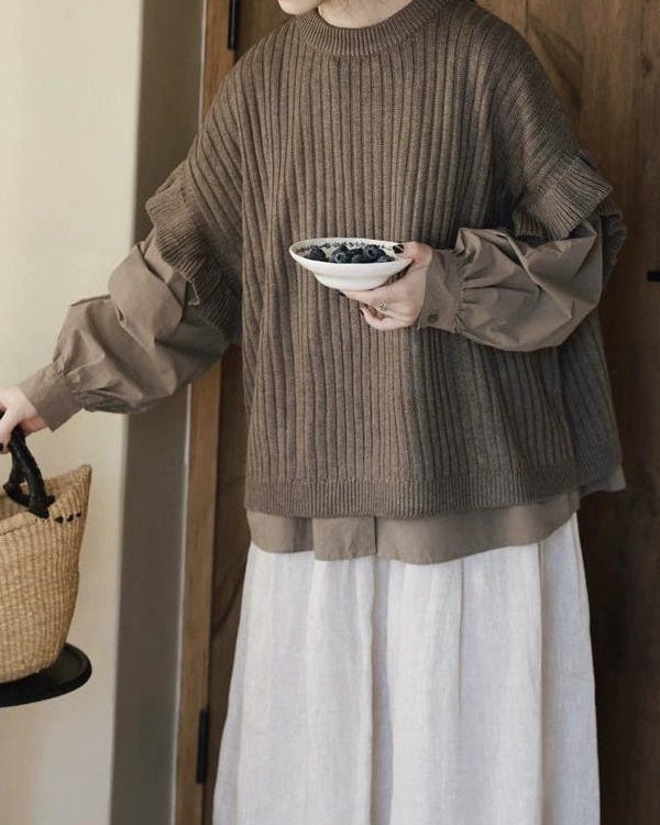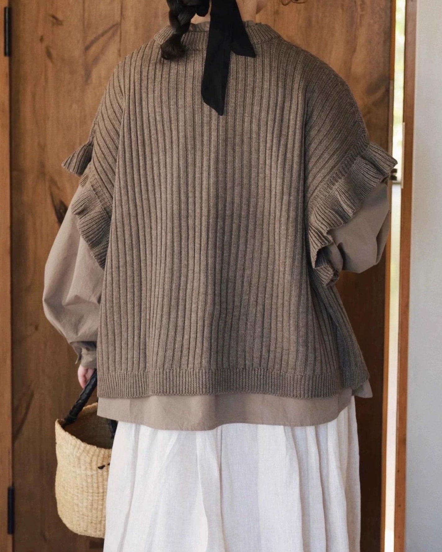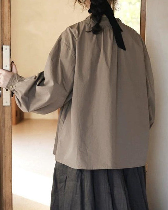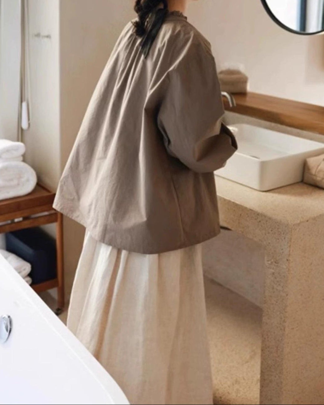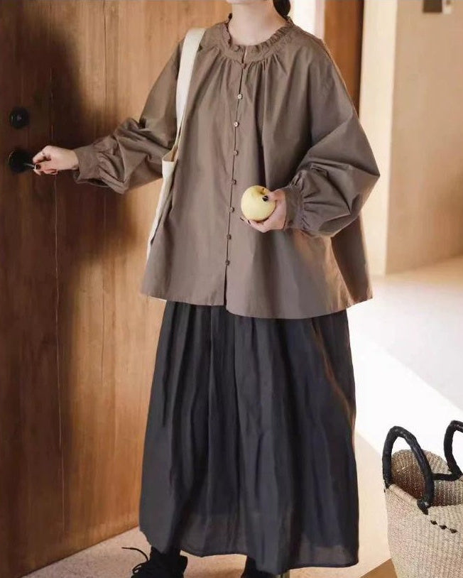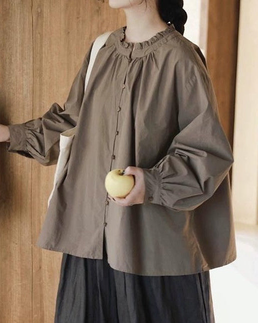 柔らかなモカ色のコットン素材を使用したブラウス。特徴的なフリルの襟と、丸みを帯びたシルエットで優しい印象を与えます。ボリュームのある袖がカジュアルでありながらも洗練さを演出。季節を問わず、日常のコーディネートに取り入れやすい一枚です。
